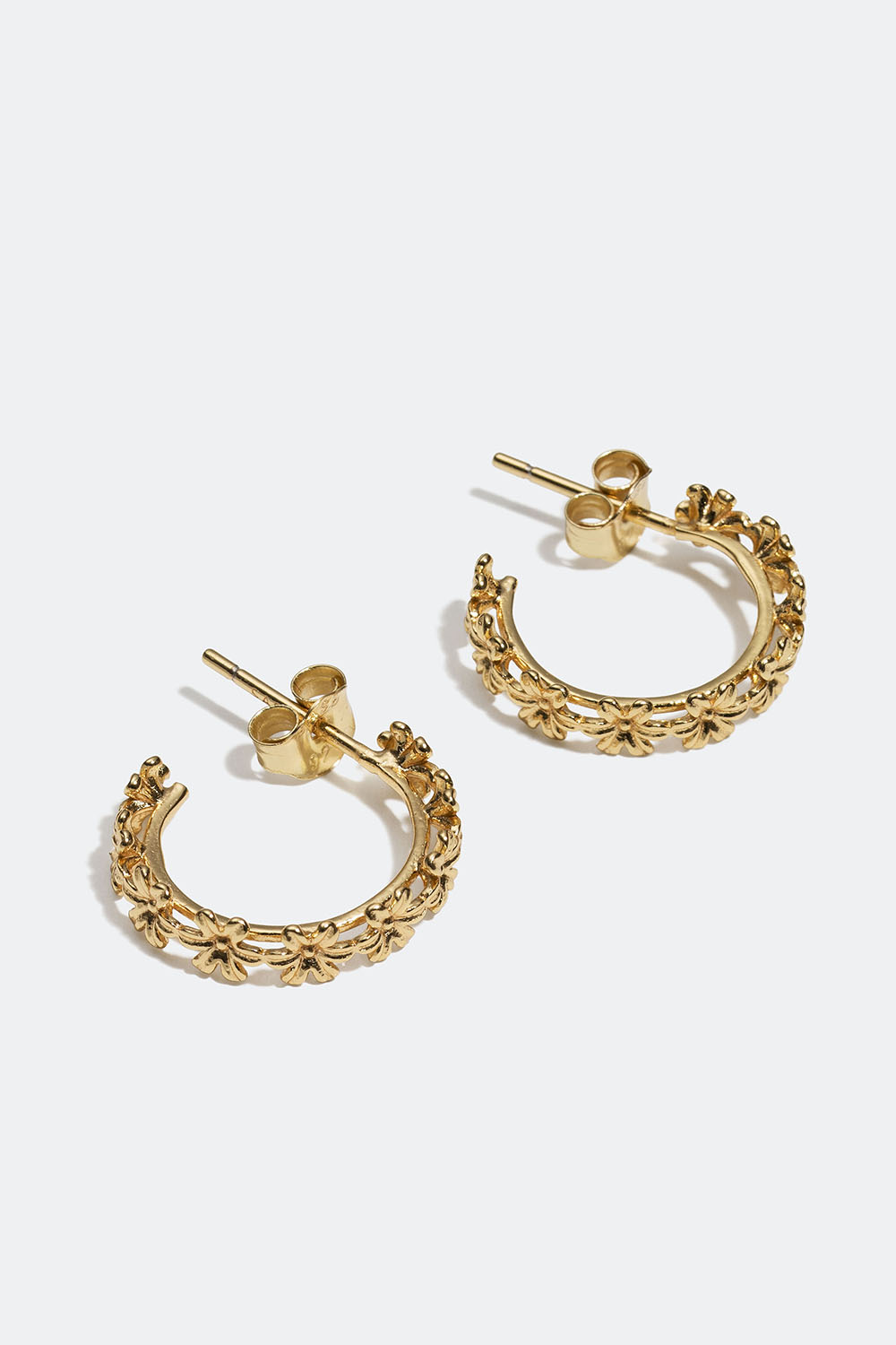 18 karaatin kullatut aidot hopeakorvarenkaat, joissa on pieniä kukkia. Tyylikkäät korvakorut, joissa on koristeellinen muotoilu.