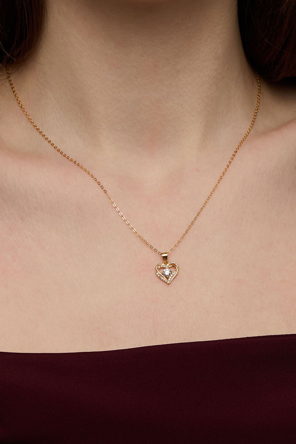 18k kullalla kullattu aito hopeakaulakoru yhteen liitetyillä hopeasydämillä, joista toinen on koristeltu Cubic Zirkonia -kivillä. Sydänten keskellä on suurempi kivi.