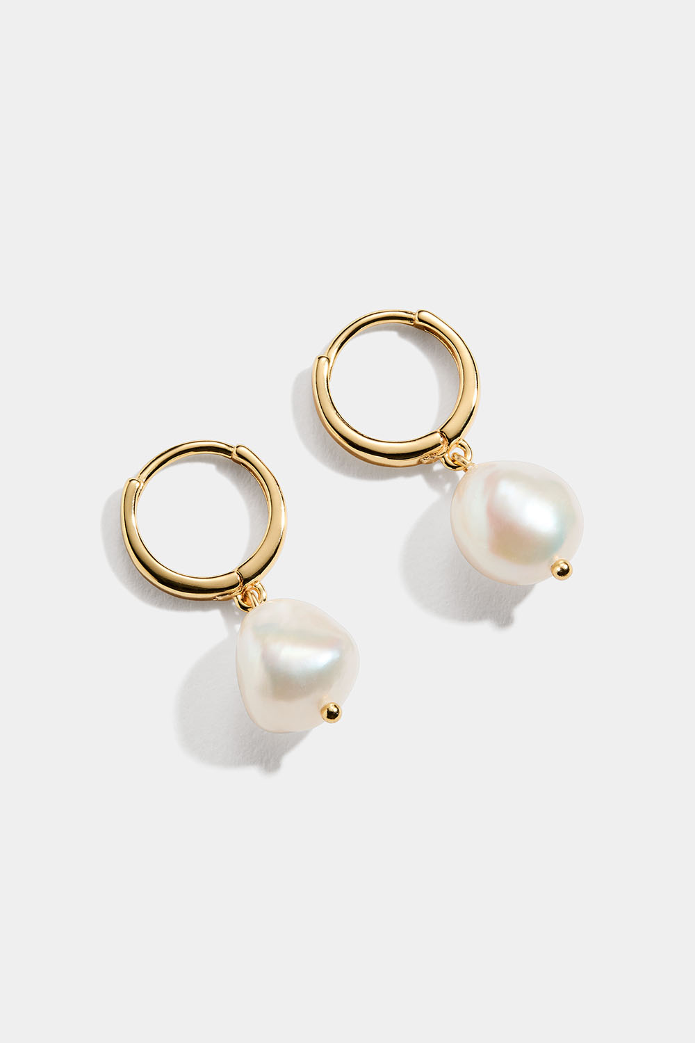 Pienet 18k kullatut hopeakorvarenkaat, jossa riippuu orgaanisen muotoinen helmi.