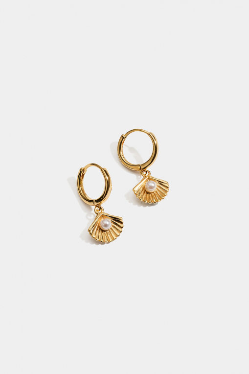 Korvarenkaat 18k kullalla kullattua hopeaa koristeltuina simpukankuorella ja helmellä.