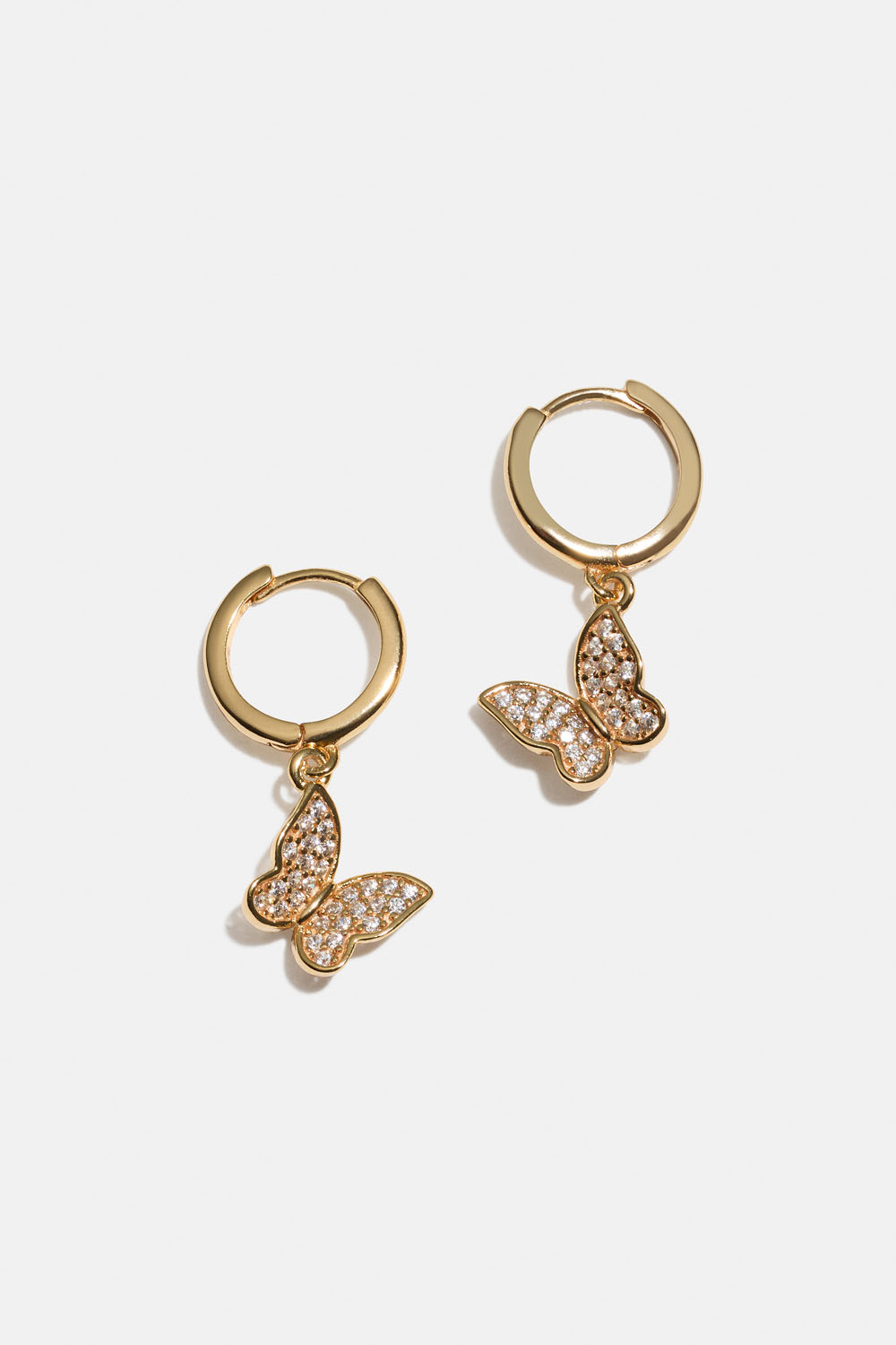 Pienet 18k kullatut hopeakorvarenkaat, joissa riippuu valkoisilla Cubic zirconia -kivillä koristeltuja perhosia.