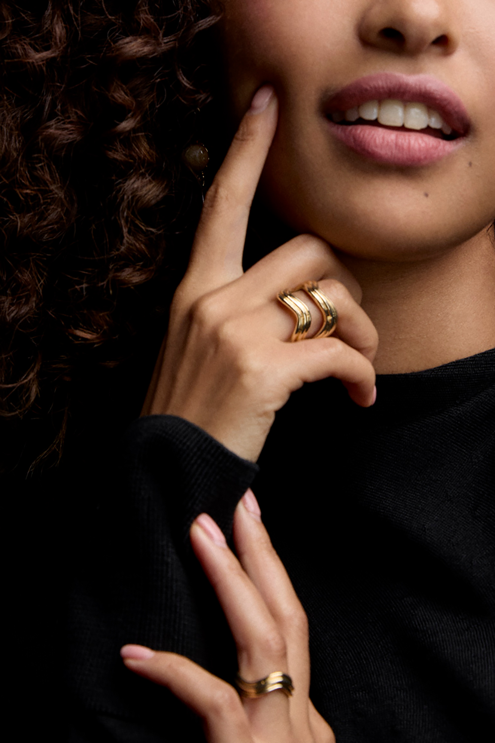 Muodoltaan aaltoileva kullanvärinen metallisormus, jossa on uurrettu pinta.