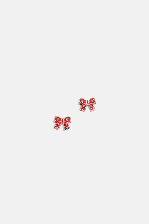 Pienet aidot hopeanappikorvakorut, joissa on valkoisilla kivillä somistetut punaiset rusetit.