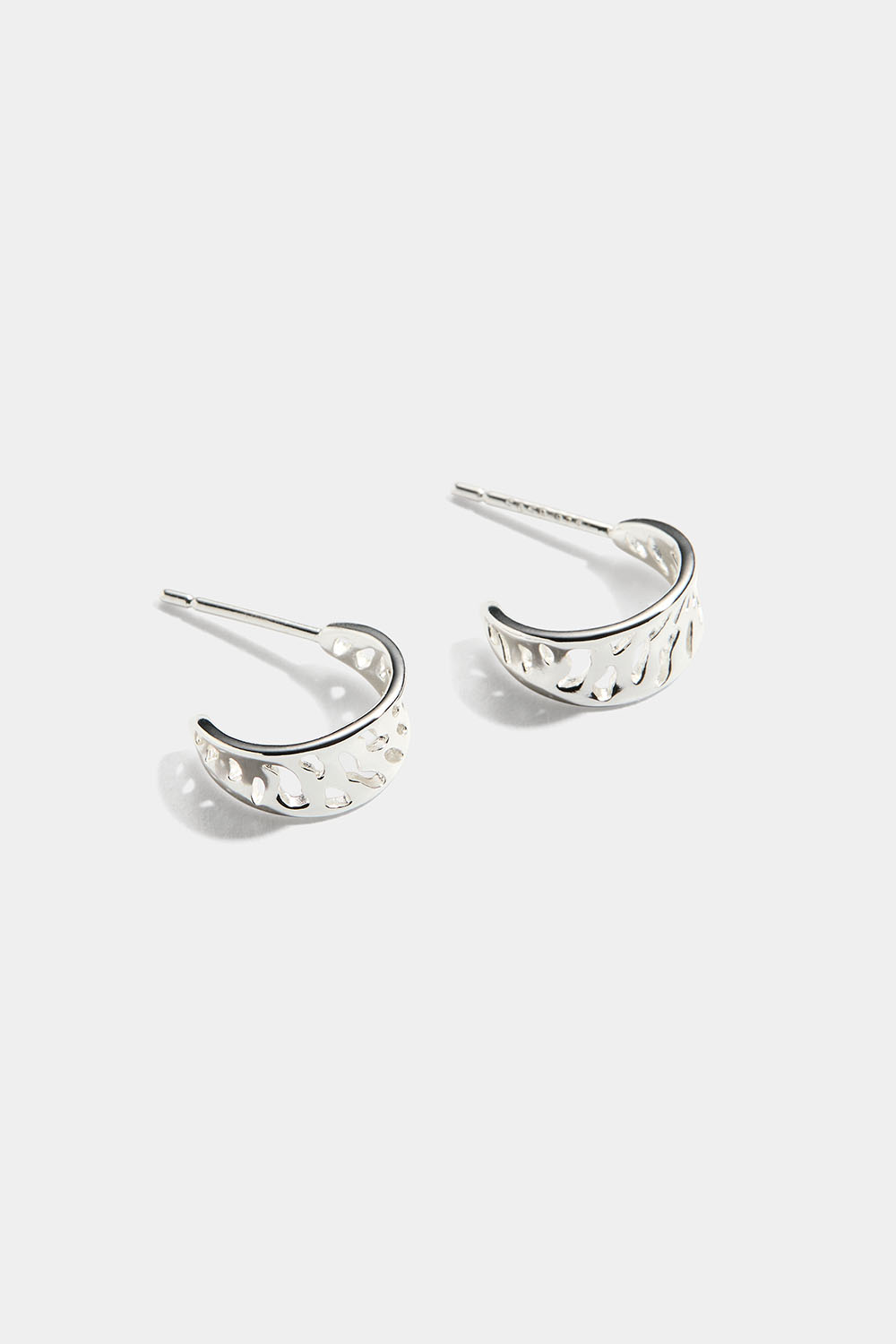 Leveät hopeakorvarenkaat, jossa on pyöreästi kaiverrettuja yksityiskohtia.