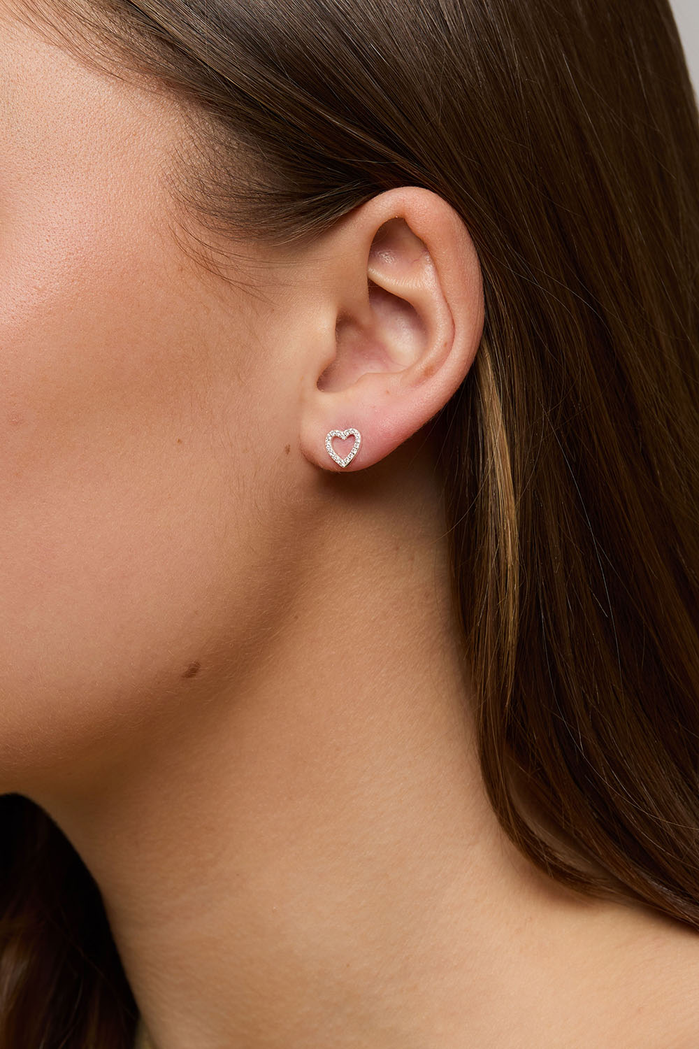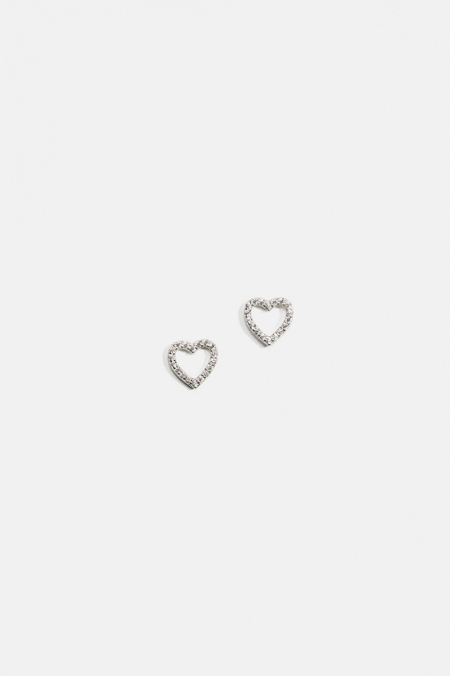 Aidot sydämenmuotoiset hopeanappikorvakorut, jotka on koristeltu pienillä Cubic zirconia -kivillä.