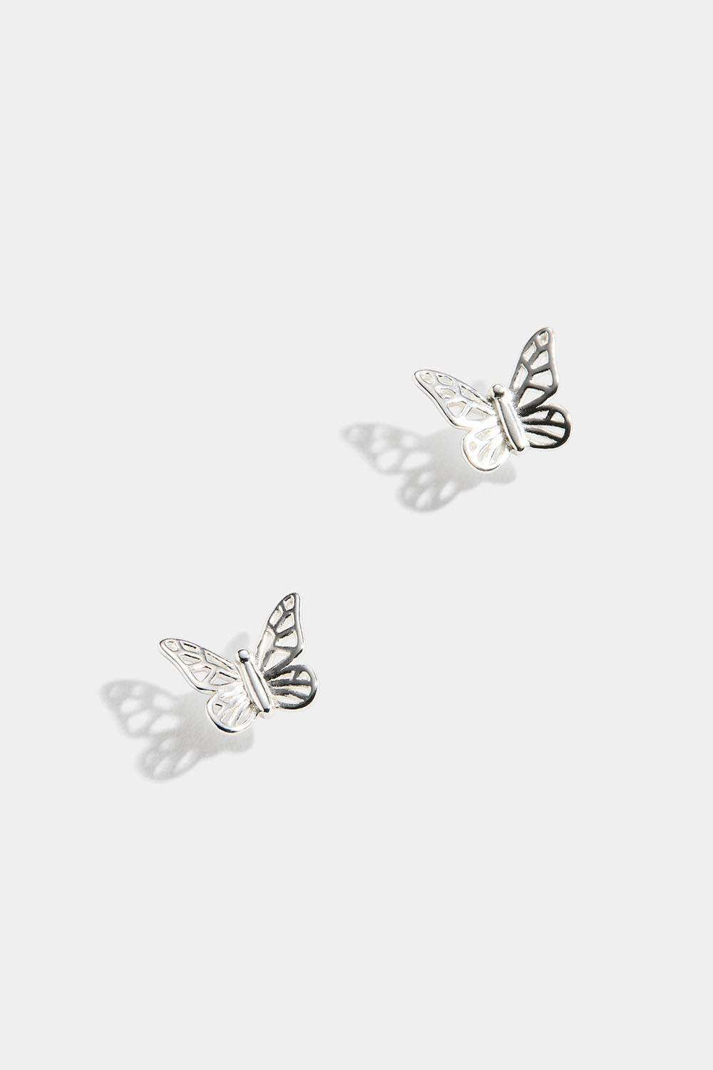 Pienet hopeanappikorvakorut, jossa on yksityiskohtaisia perhosia.