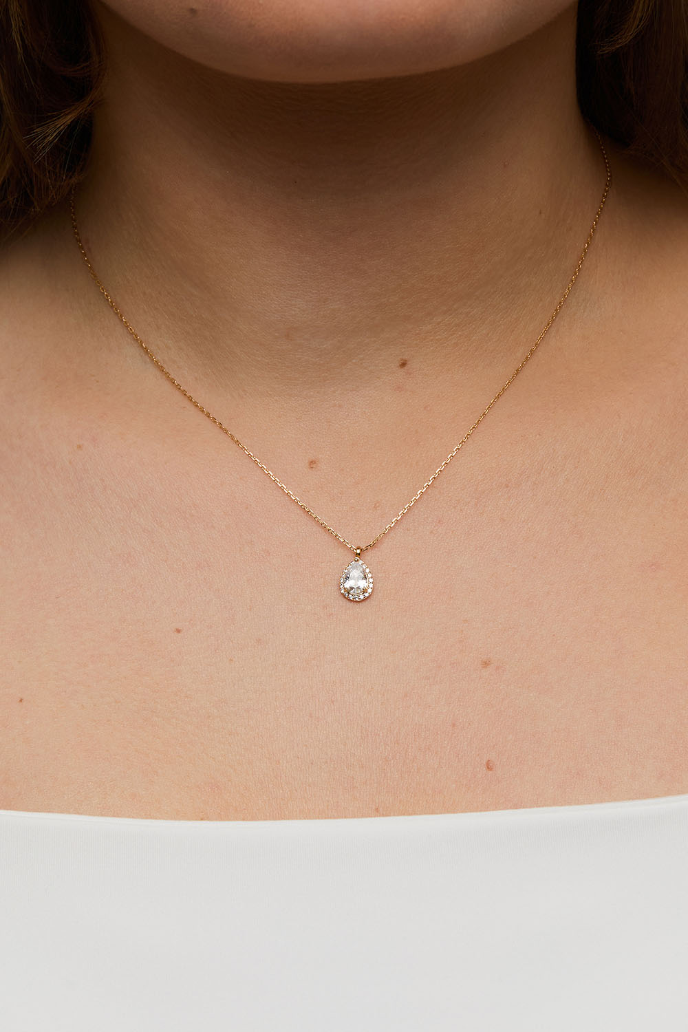 Aito 18k kullattu hopeakaulaketju, jossa on suurempi pisaranmuotoinen Cubic zirconia -riipus ja ympärillä pieniä kiviä.