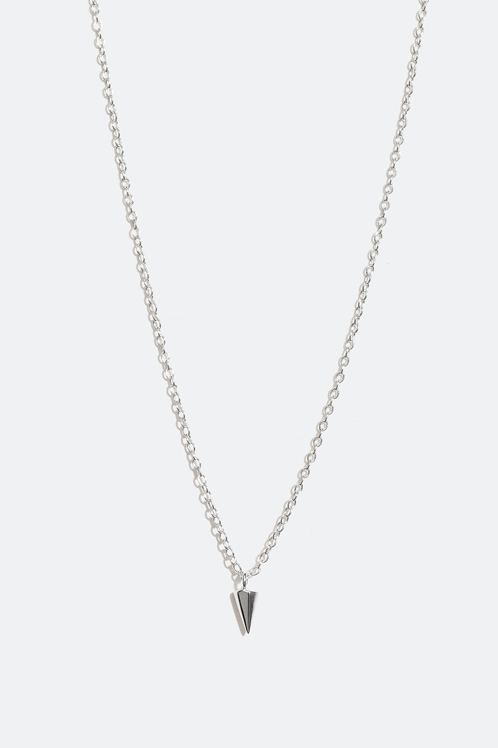 Aito hopeakaulakoru, jossa on kapea ketju ja riipuksena pieni sileä niitti. Tyylikäs kaulakoru, jossa on koristeellinen yksityiskohta.