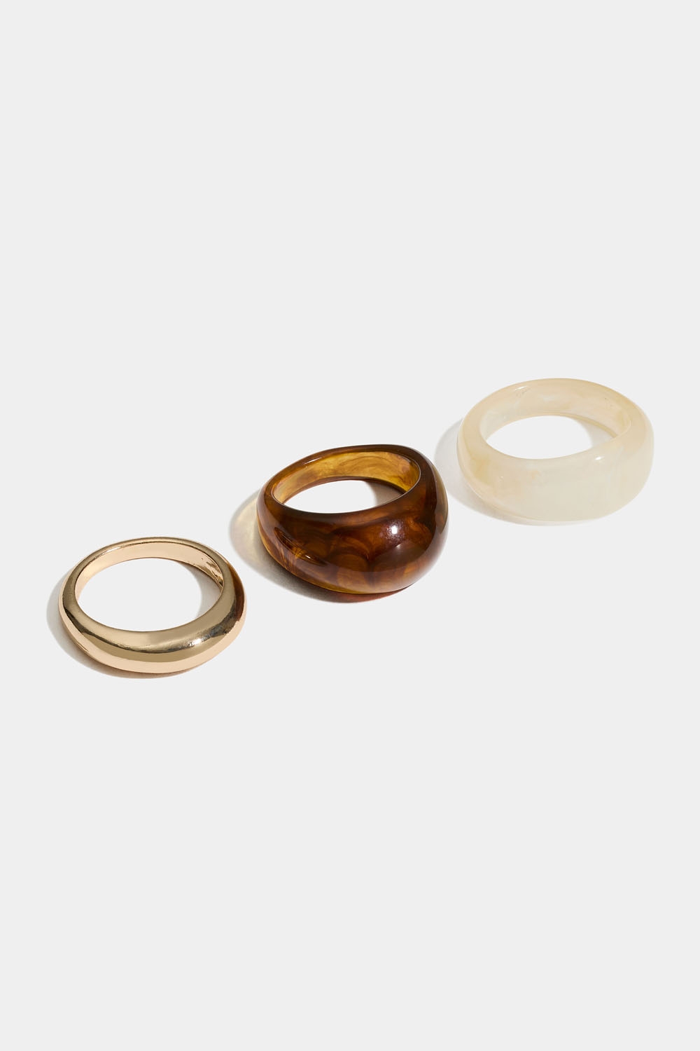 Kolme orgaanisen muotoista sormusta. Yksi on kullanväristä metallia ja kaksi beigeä ja ruskeaa akryylia.