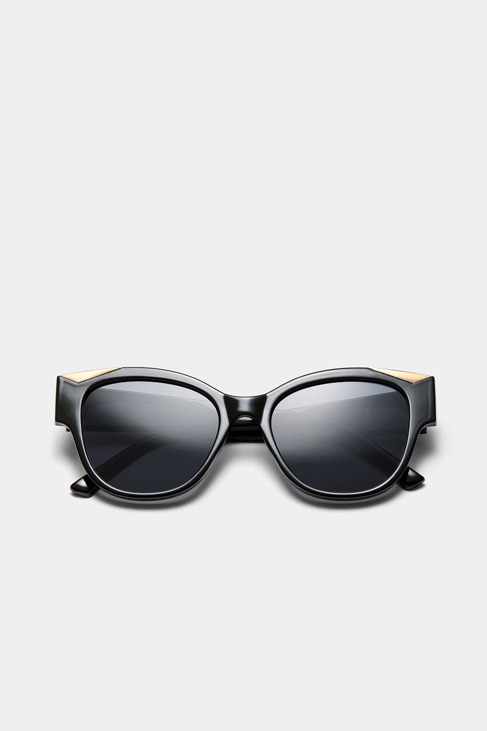 Klassinen musta aurinkolasimalli, jossa on kolmikulmaisia, kullanvärisiä yksityiskohtia kehyksiin asti.