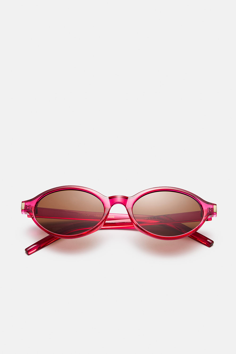 Sievät soikeat aurinkolasit, joissa on punaiset läpinäkyvät kehykset ja kullanvärisiä yksityiskohtia. Tyylikkäät aurinkolasit, josta tulee nopeasti suosikkiasusteesi.