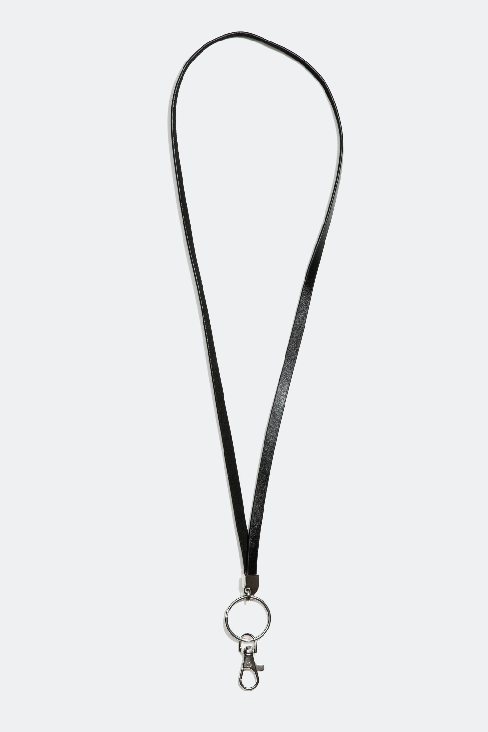 Avaimenperä, jossa on pitkä, kapea nauha nahkajäljitelmää. Avaimenperässä on karabiinihaka ja pyöreä metallinen avainrengas.