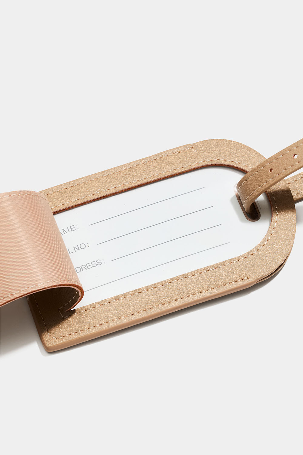 Beige tekonahkainen matkatavaralappu, joka kiinnitetään laukkuun. Voit kirjoittaa tietosi lapun osoitelappuun.