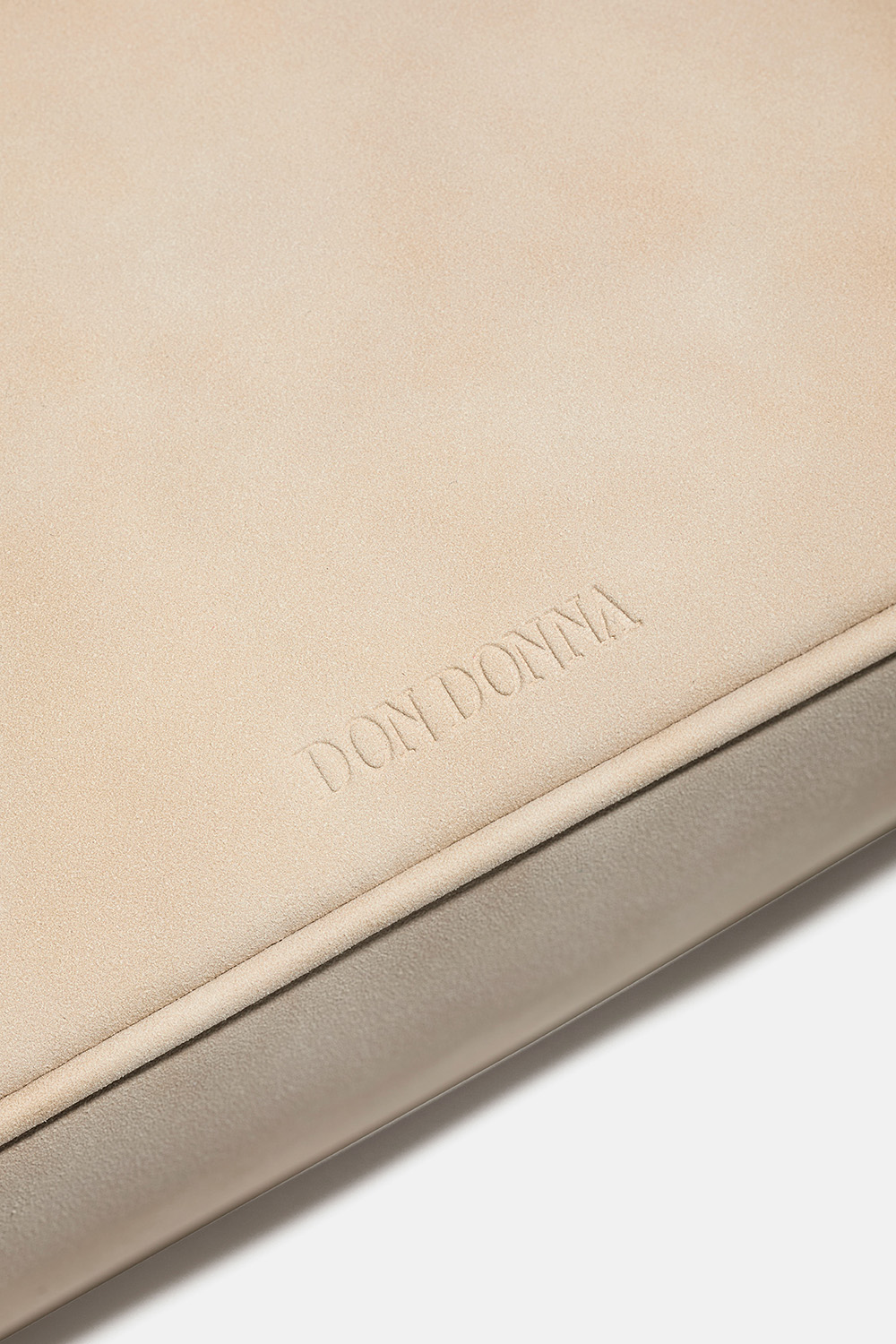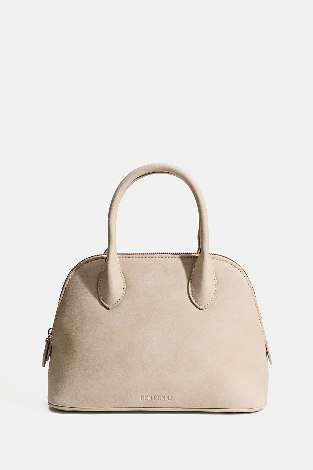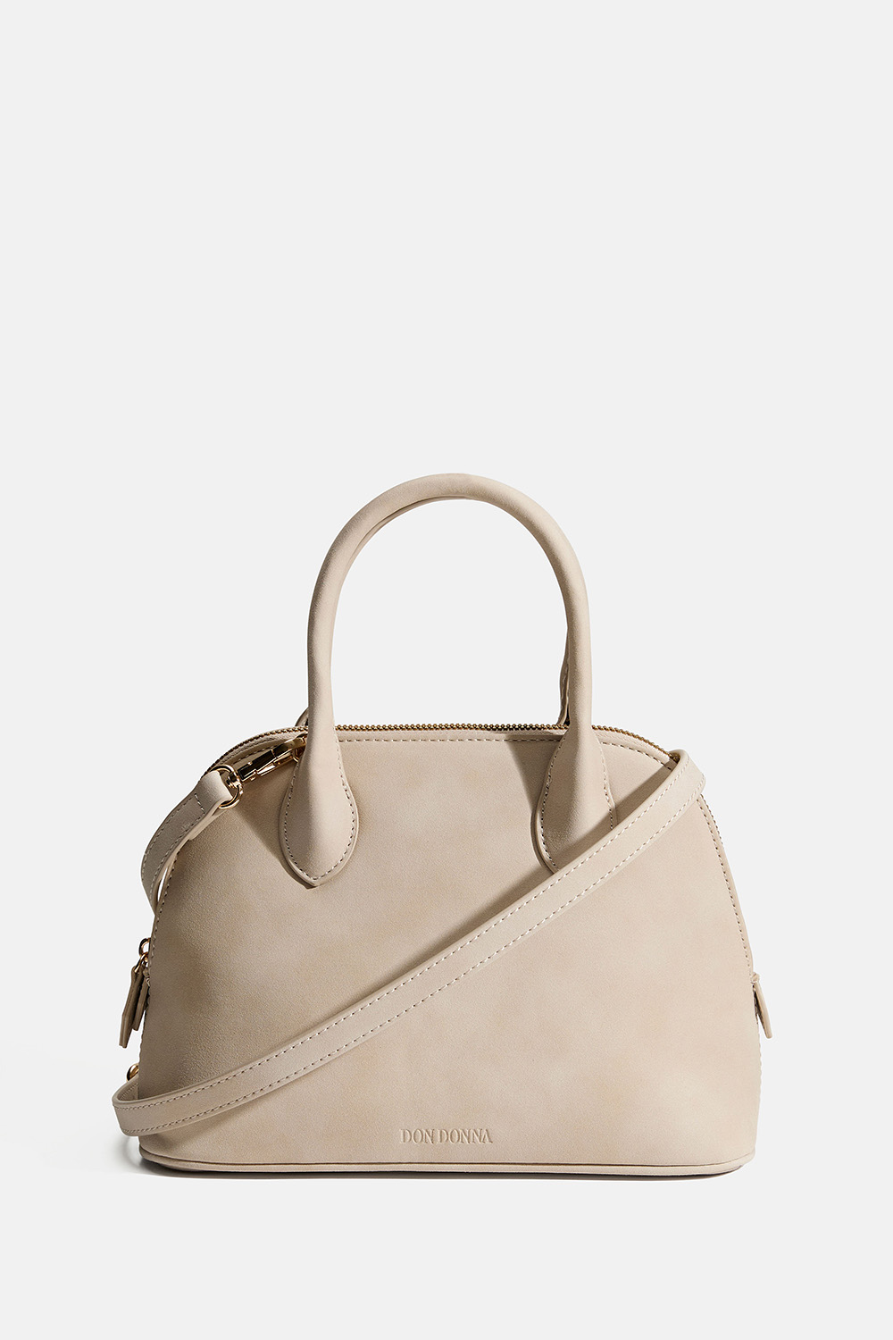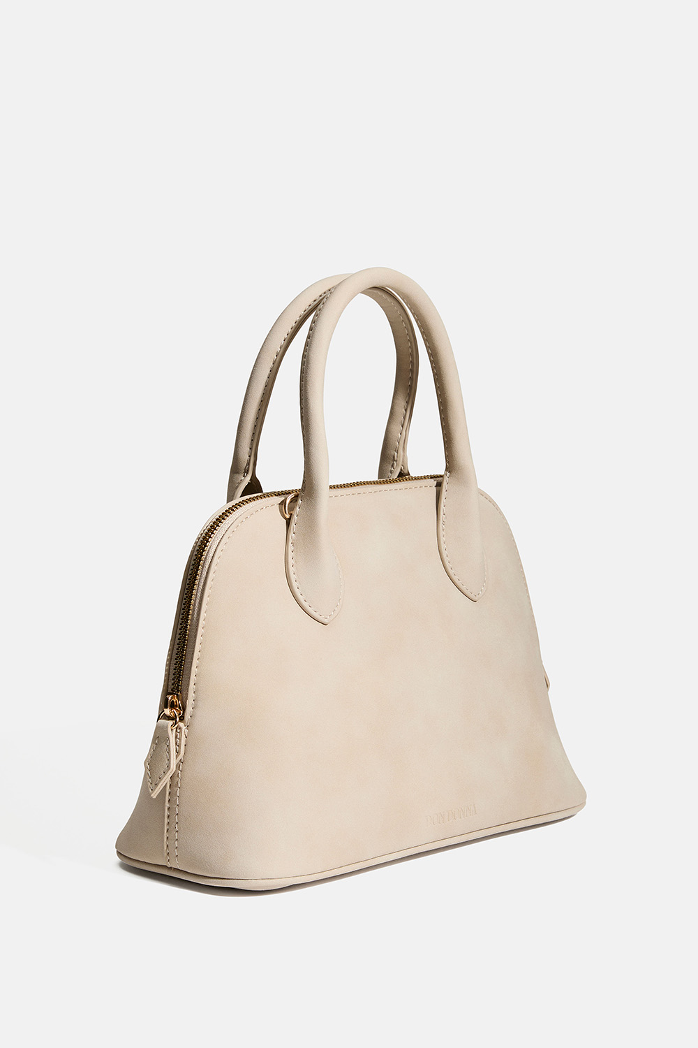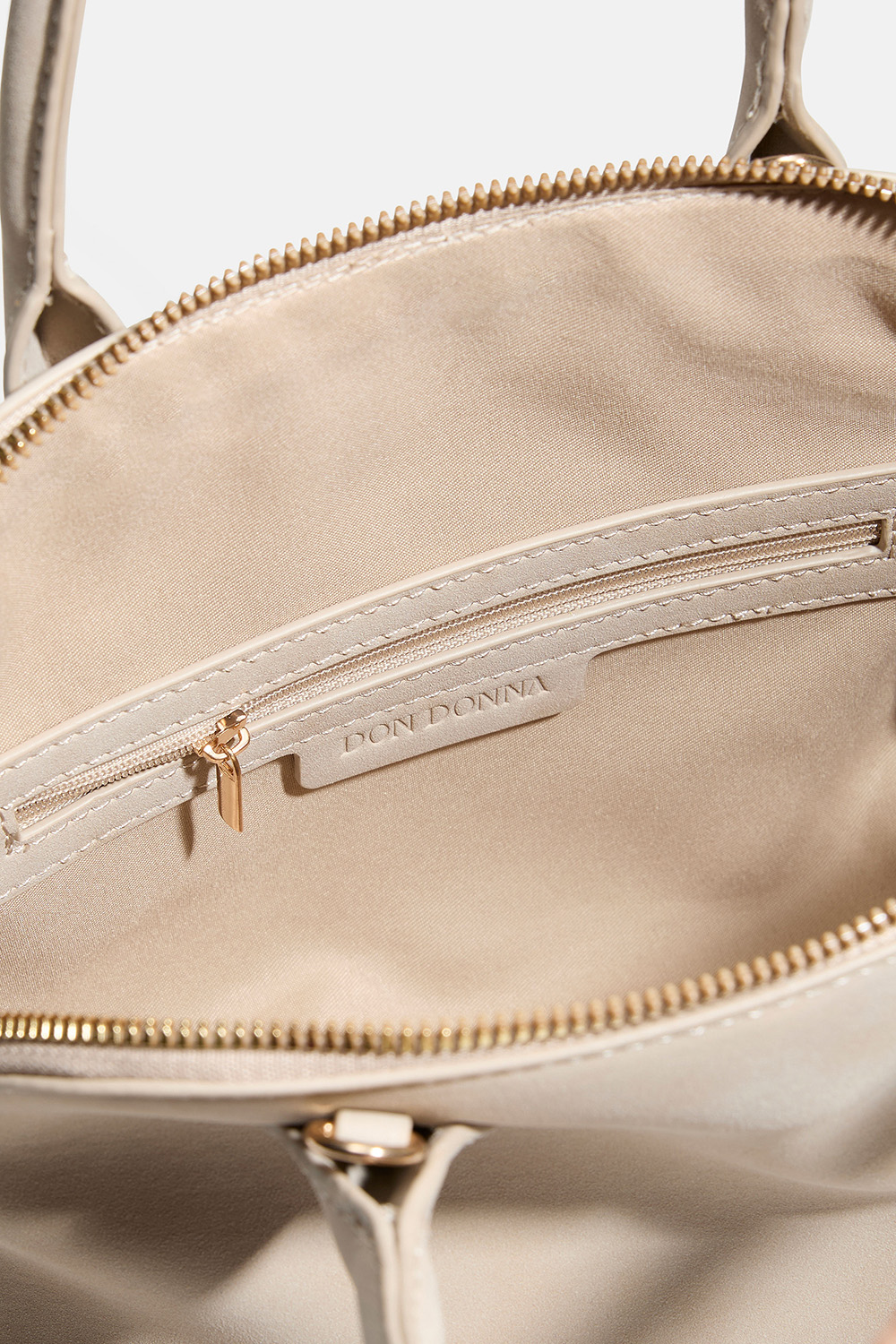 Beige tekomokkanahkainen käsilaukku, jossa on kaksi kahvaa ja Don Donna -logo. Laukun sisällä on yksi suuri ja yksi pienempi tasku, jonka voi sulkea vetoketjulla. Mukana säädettävä olkahihna.
