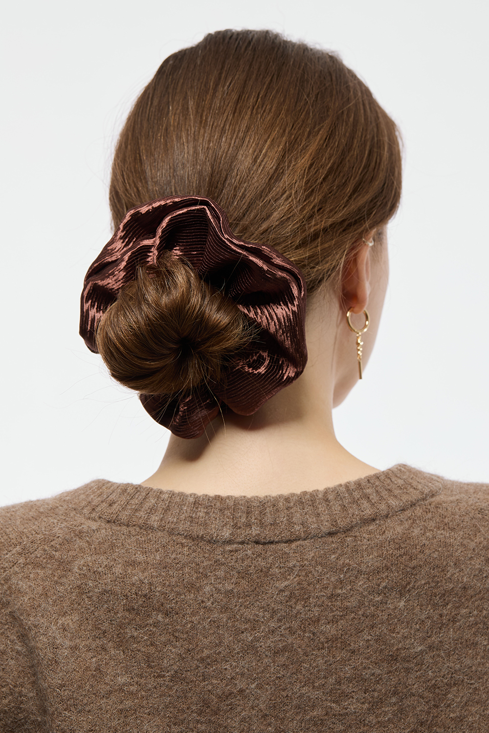 Beige hiusdonitsi kiiltävästä pliseeratusta kankaasta.