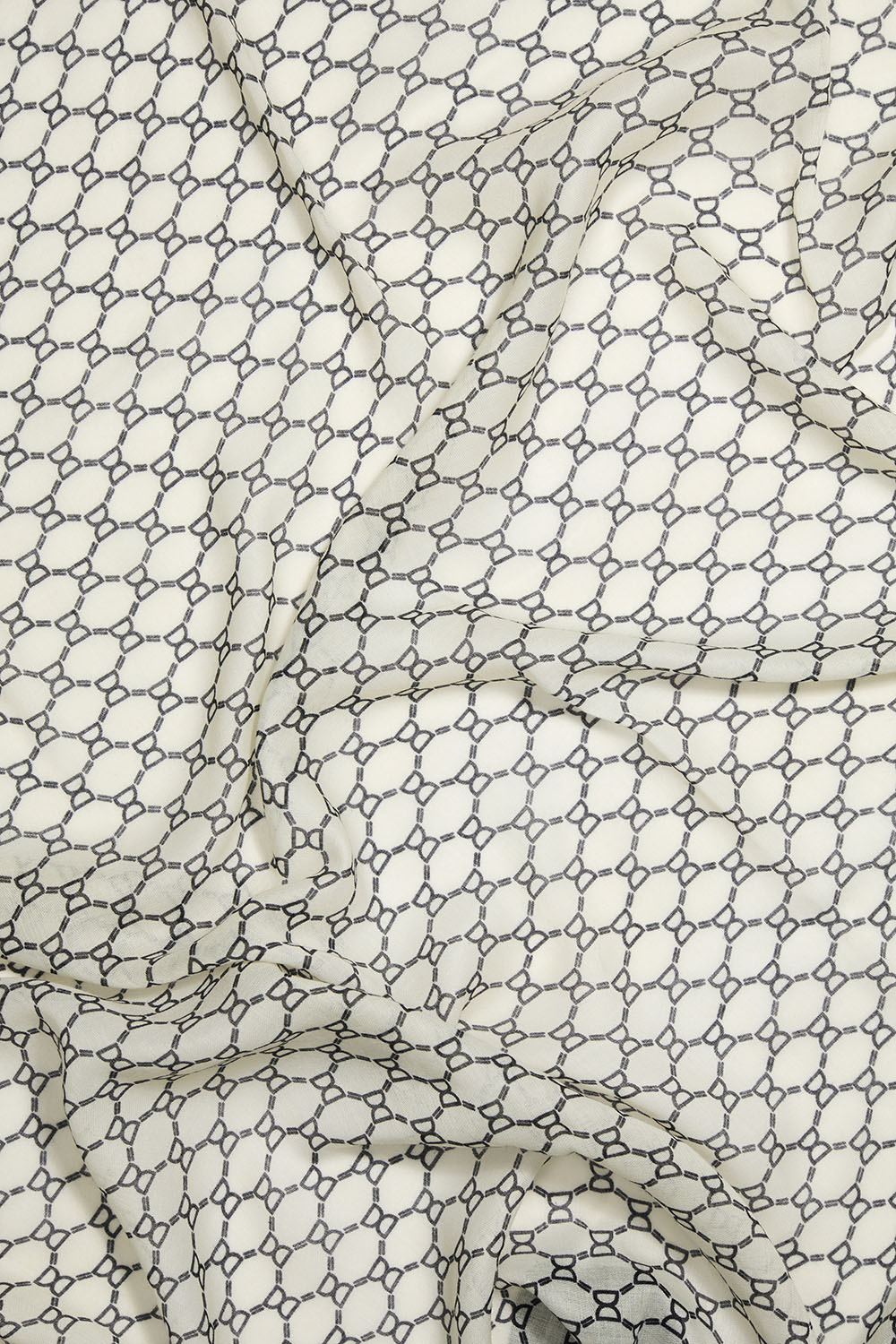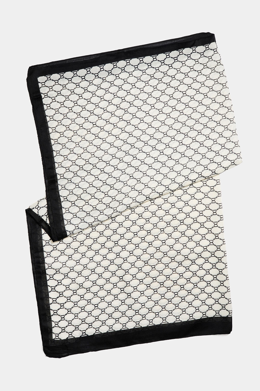 Suuri suorakaiteen muotoinen huivi ohuesta materiaalista, jossa on mustavalkoinen DD-kuvio.