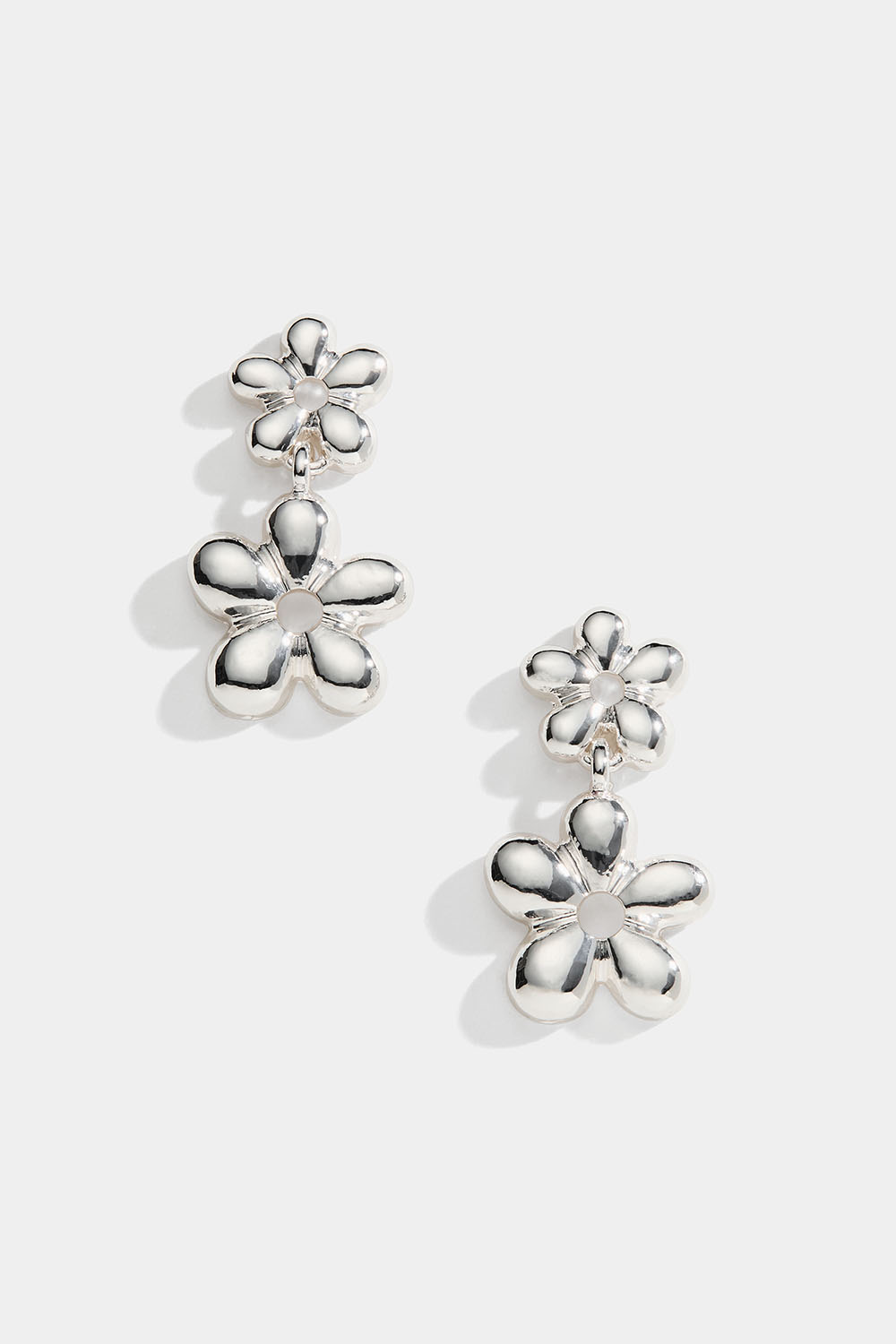 Kaksi roikkuvaa kukkaa kullanvärisestä metallista.