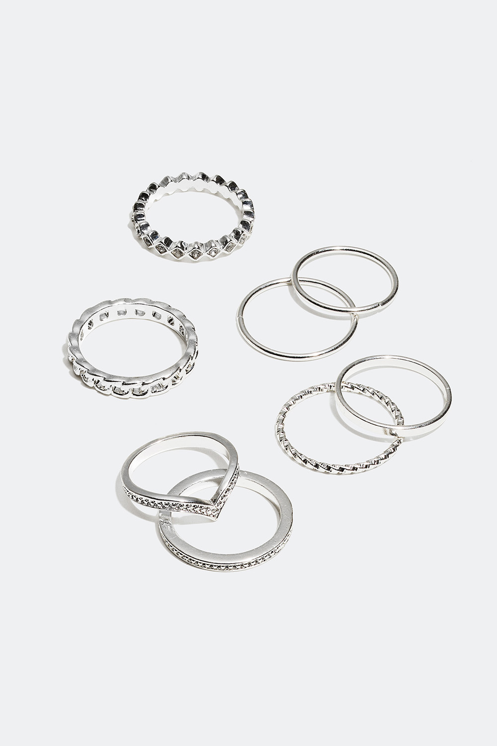 8-pakkaus sormuksia, jotka ovat eri muotoisia ja kokoisia, jotta sormuksia voi käyttää samanaikaisesti eri sormissa. Pakkauksessa on sormuksia koossa 16/17/18 tai 18/19/20. Täydellinen sormusvalikoima, josta löytyy sekä sileää, kuviollista että kierrettyä muotoilua ja koristeellisia lasikiviä.