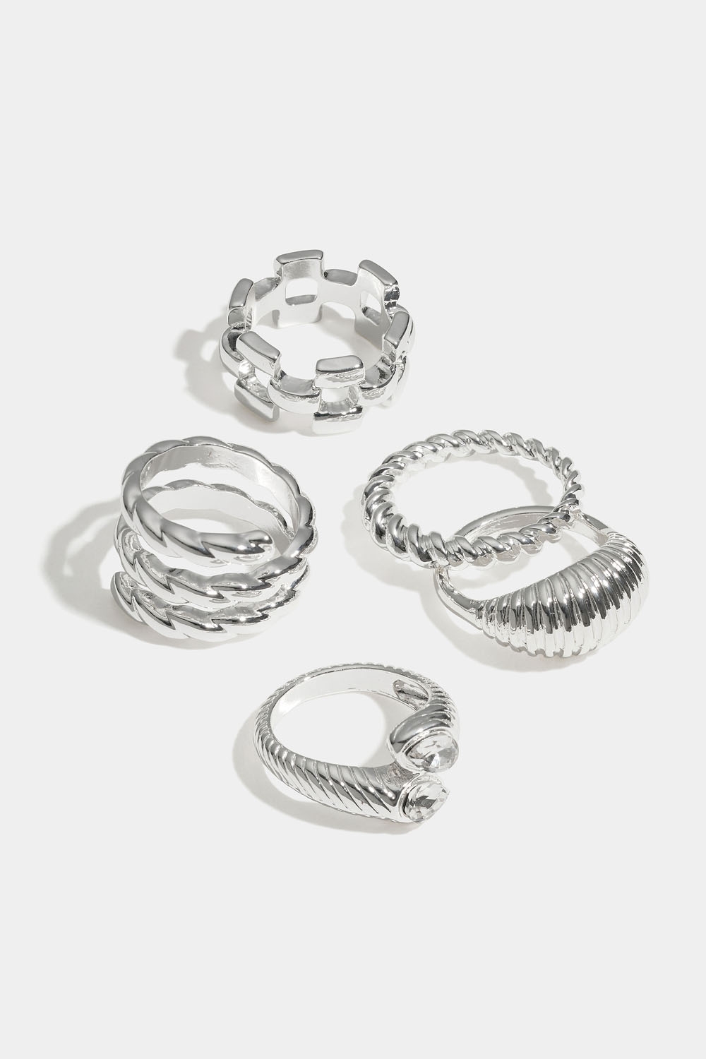 Viisi eri muotoista sormusta, joissa on uurrettu ja kierretty pinta.