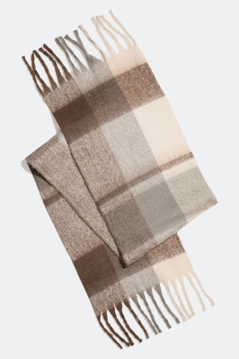 Suuri, pehmeä kaulahuivi, jossa on harjattu pinta. Huivin ruudullisessa kuviossa on beigen ja ruskean sävyjä, ja sen päissä on pitkät hapsut.