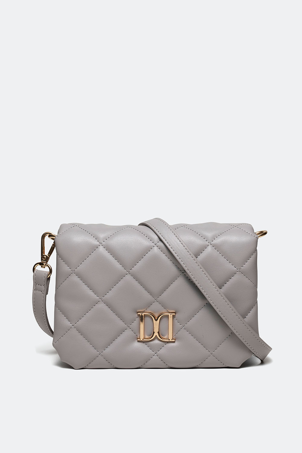 Pieni harmaa tikattu laukku, jossa on kultainen Don Donna -solki ja olkahihna. Laukussa on yksi suuri ja yksi pienempi lokero, ja olkahihna on säädettävä ja irrotettava.