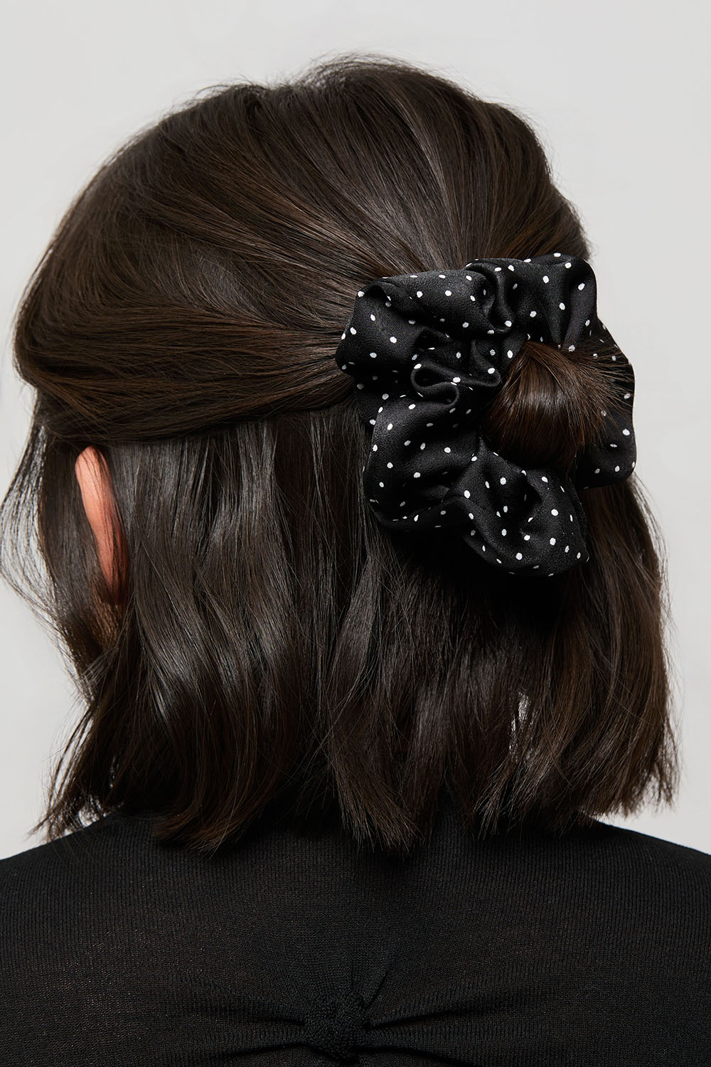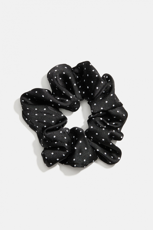Hiusdonitsi mustaa keinosilkkiä, jossa valkoisia pilkkuja ryhmässä Hiustuotteet / Scrunchie-hiusdonitsit @ Glitter (332001629400)