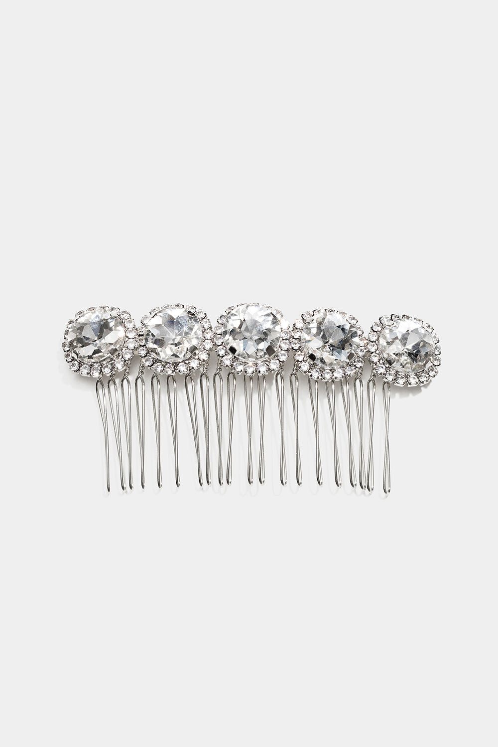 Metallinen hiuskampa, joka on koristeltu viidellä suurella valkoisella lasikivellä, joita ympäröi strassit.