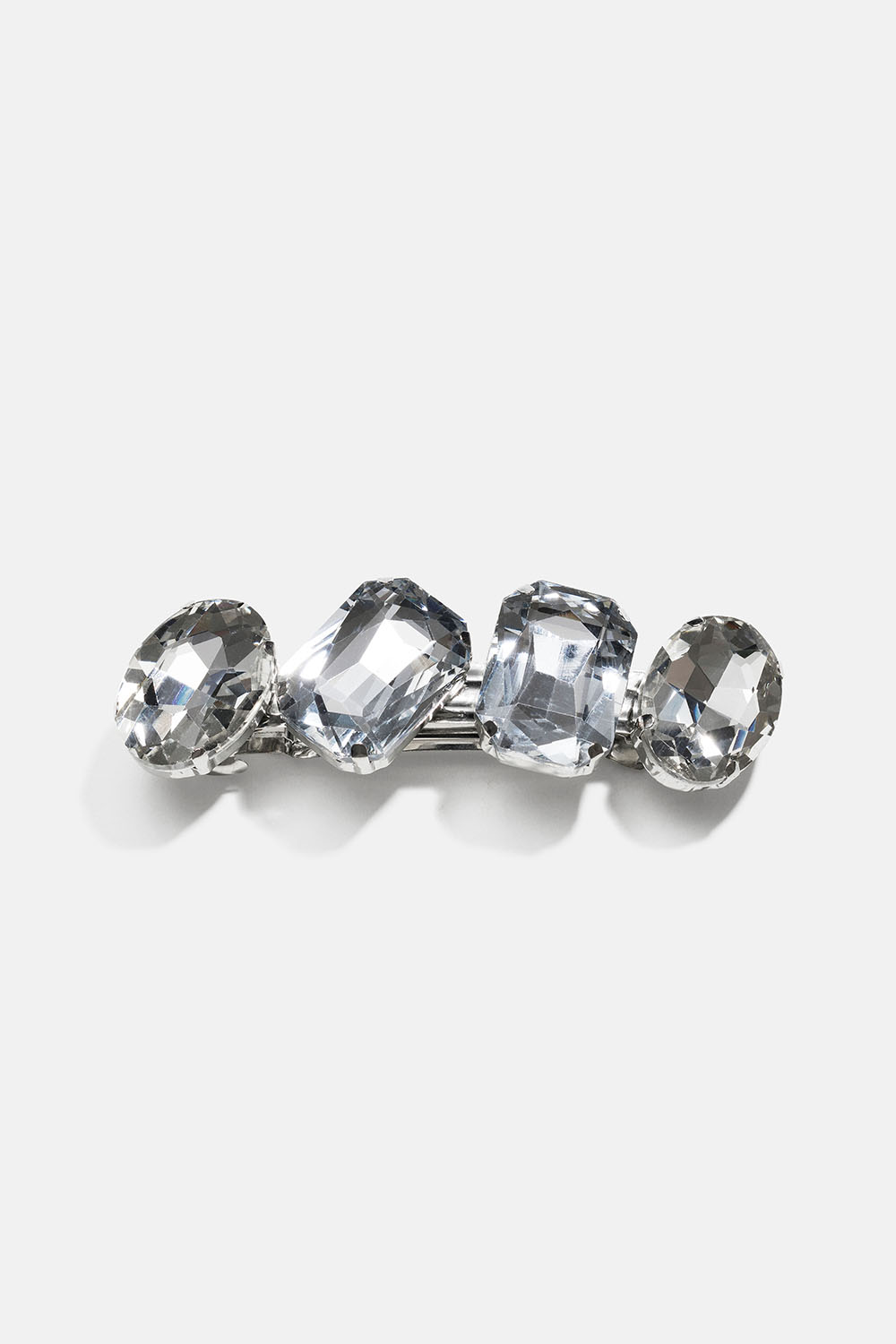Hopeanvärinen hiusklipsi, jossa on neljä erimuotoista valkoista lasikiveä.