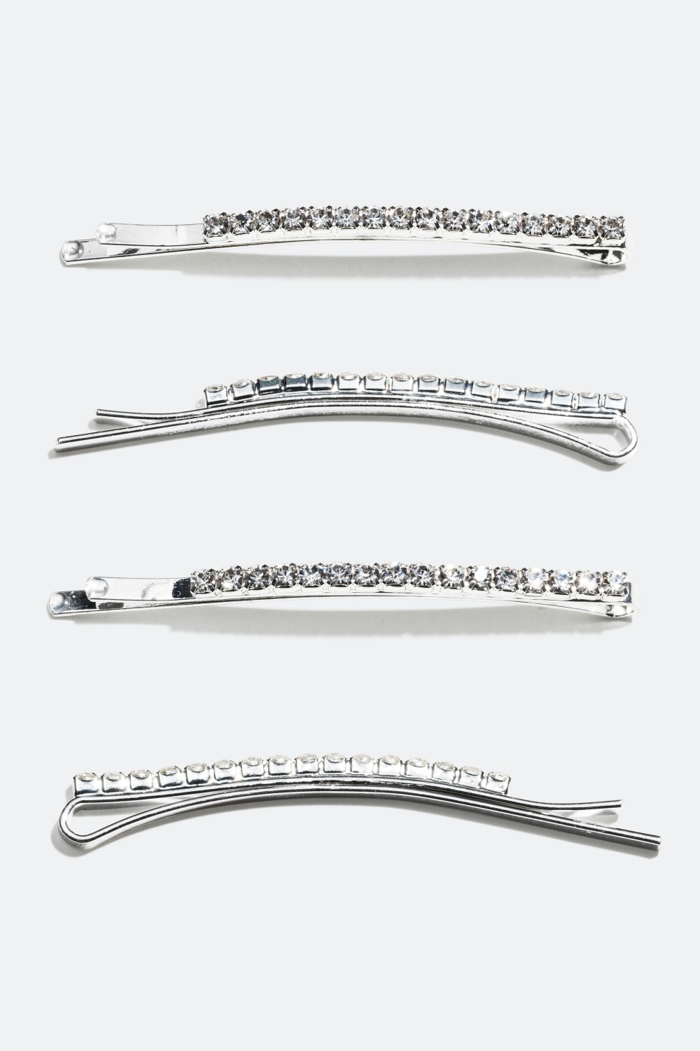 Hiuspinnit lasikiviriveillä - Metalliset hiuspinnit koristeltuna rivissä olevilla lasikivillä. Hiuspinnit toimitetaan neljän pinnin pakkauksessa.