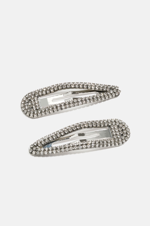Metallinen hiussolki, jossa pyöreitä valkoisia lasikiviä. Kahden soljen pakkaus.
