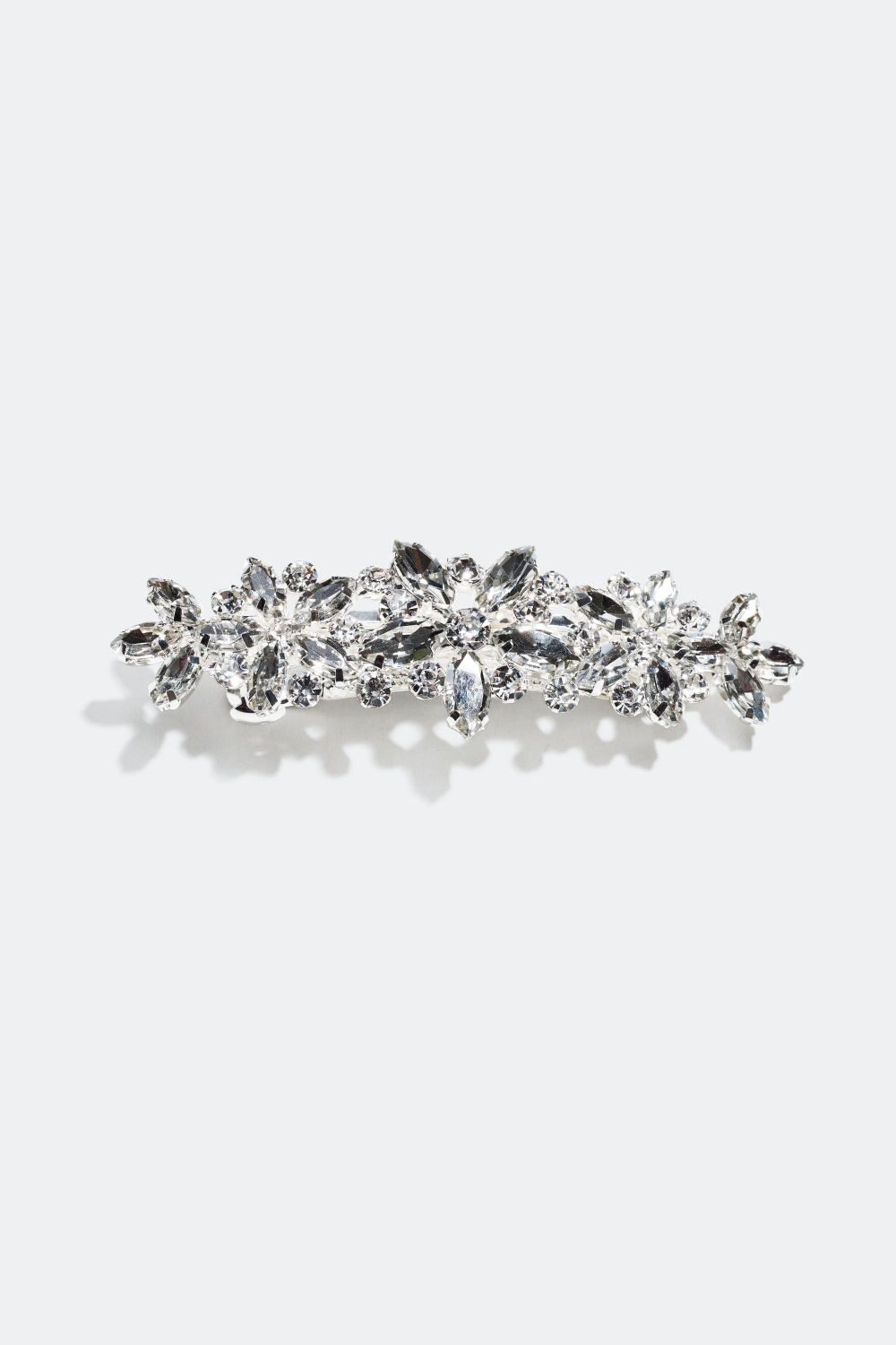 Hiussolki, jossa erikokoisista lasikivistä muodostettuja kukkia. Hopeanvärinen metallinen takaosa.