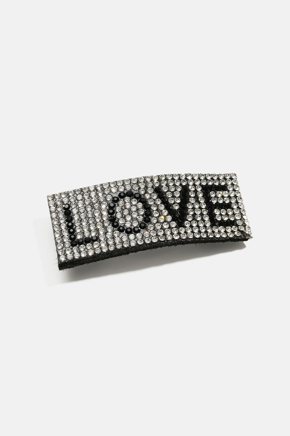 Litteä hiussolki, jossa lukee LOVE mustilla ja valkoisilla strasseilla kirjoitettuna.
