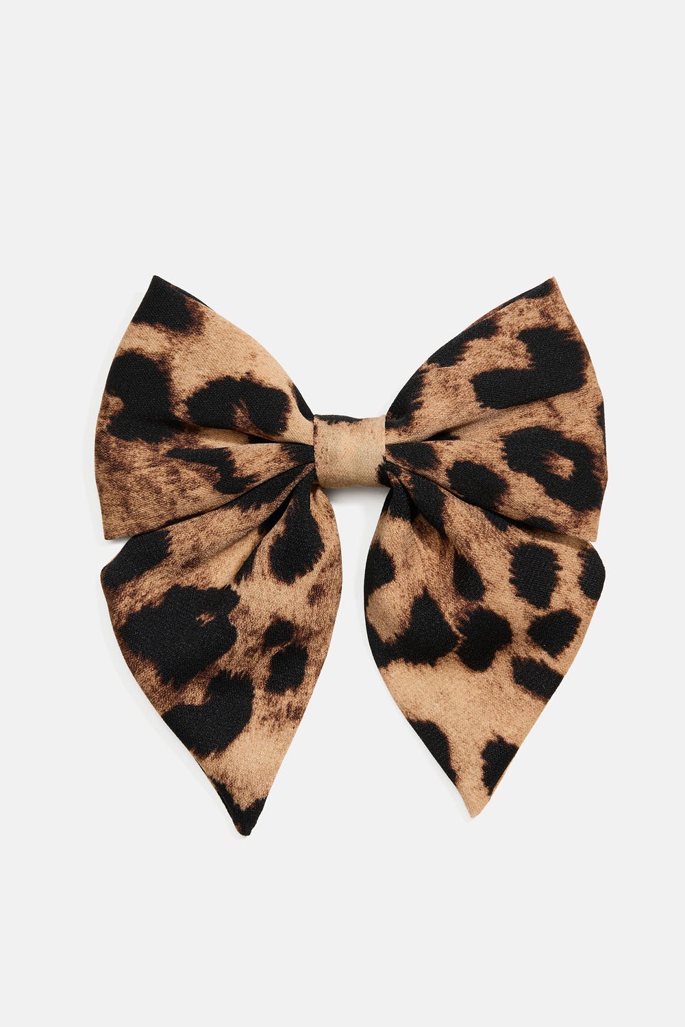 Hiussolki, jossa on nokkaklipsi ja leopardikuvioinen rusetti.