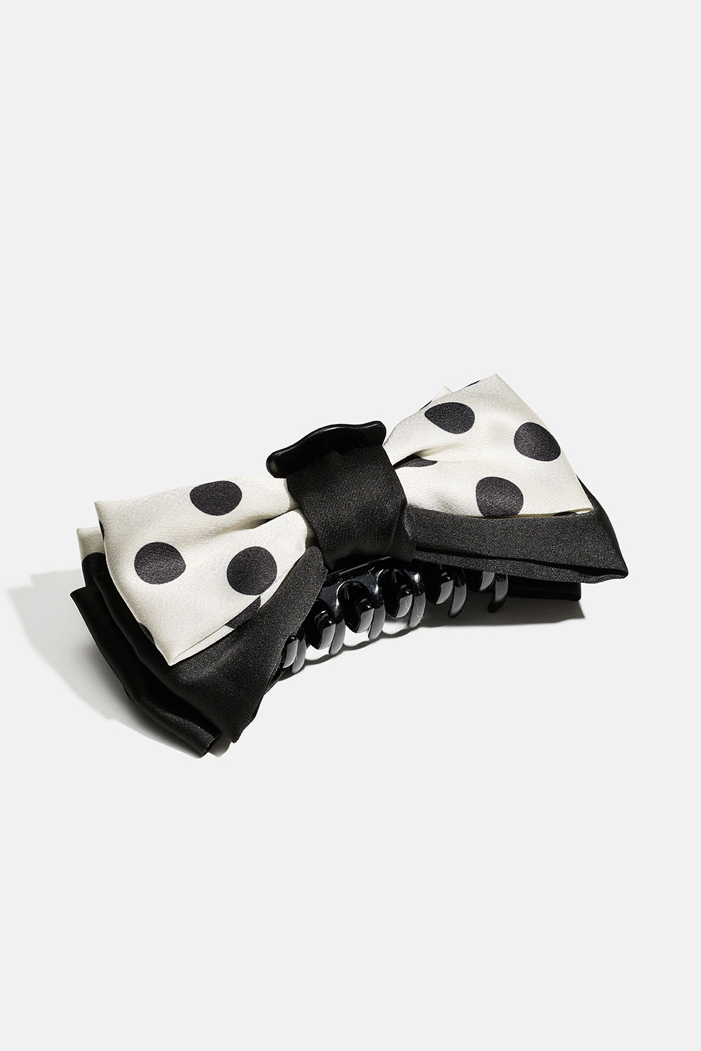 Musta muovinen hiusklipsi, jossa on pilkullinen musta kangasrusetti keinosilkistä.