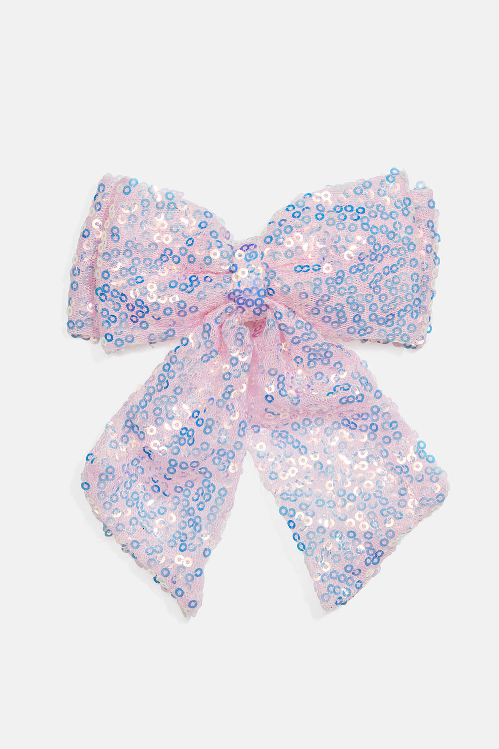 Hiussolki, jossa vaaleanpunainen rusetti paljeteilla