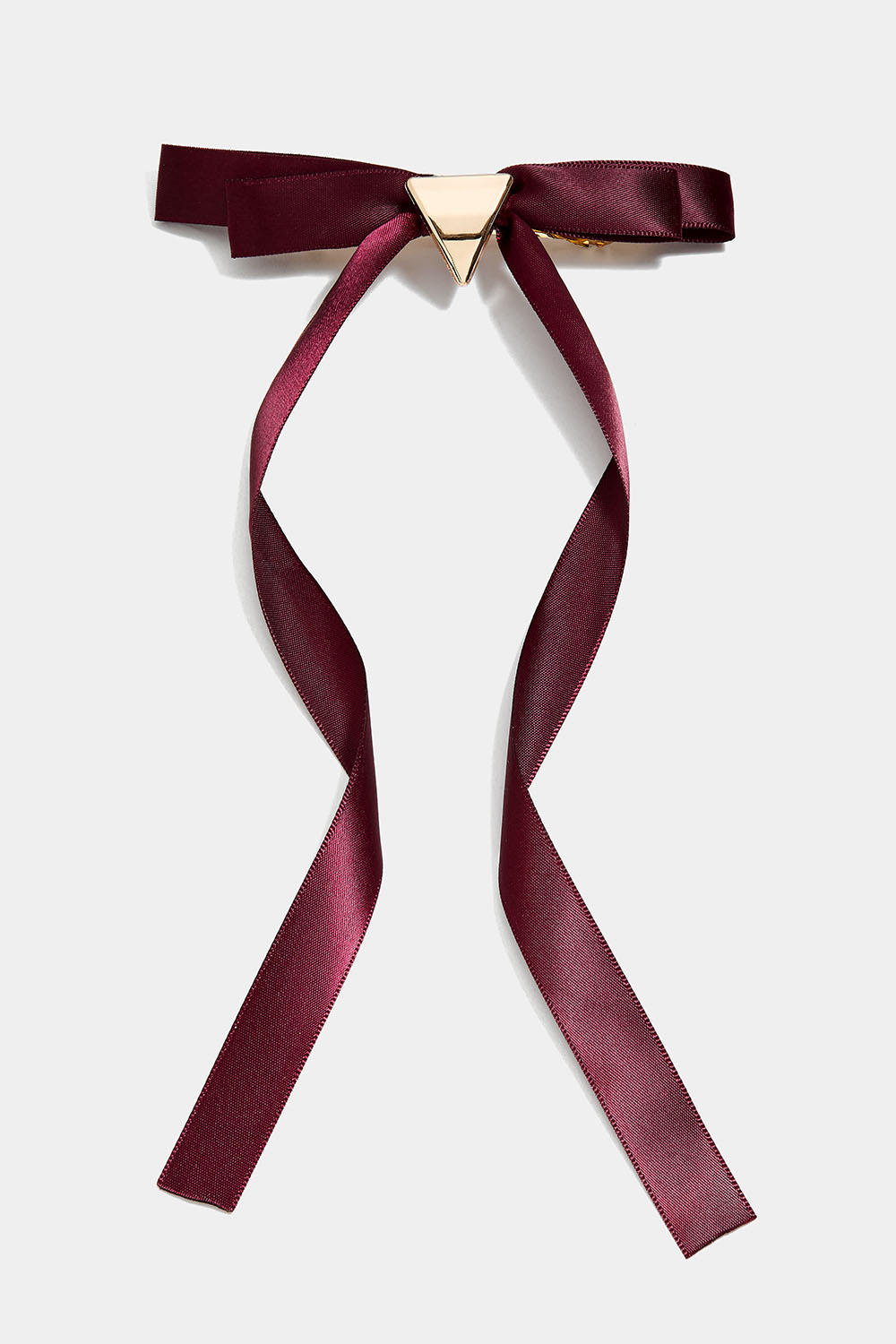 Hiussolki, jonka viinipunaisesta nauhasta valmistetun rusetin keskellä on kullanvärinen kolmio.