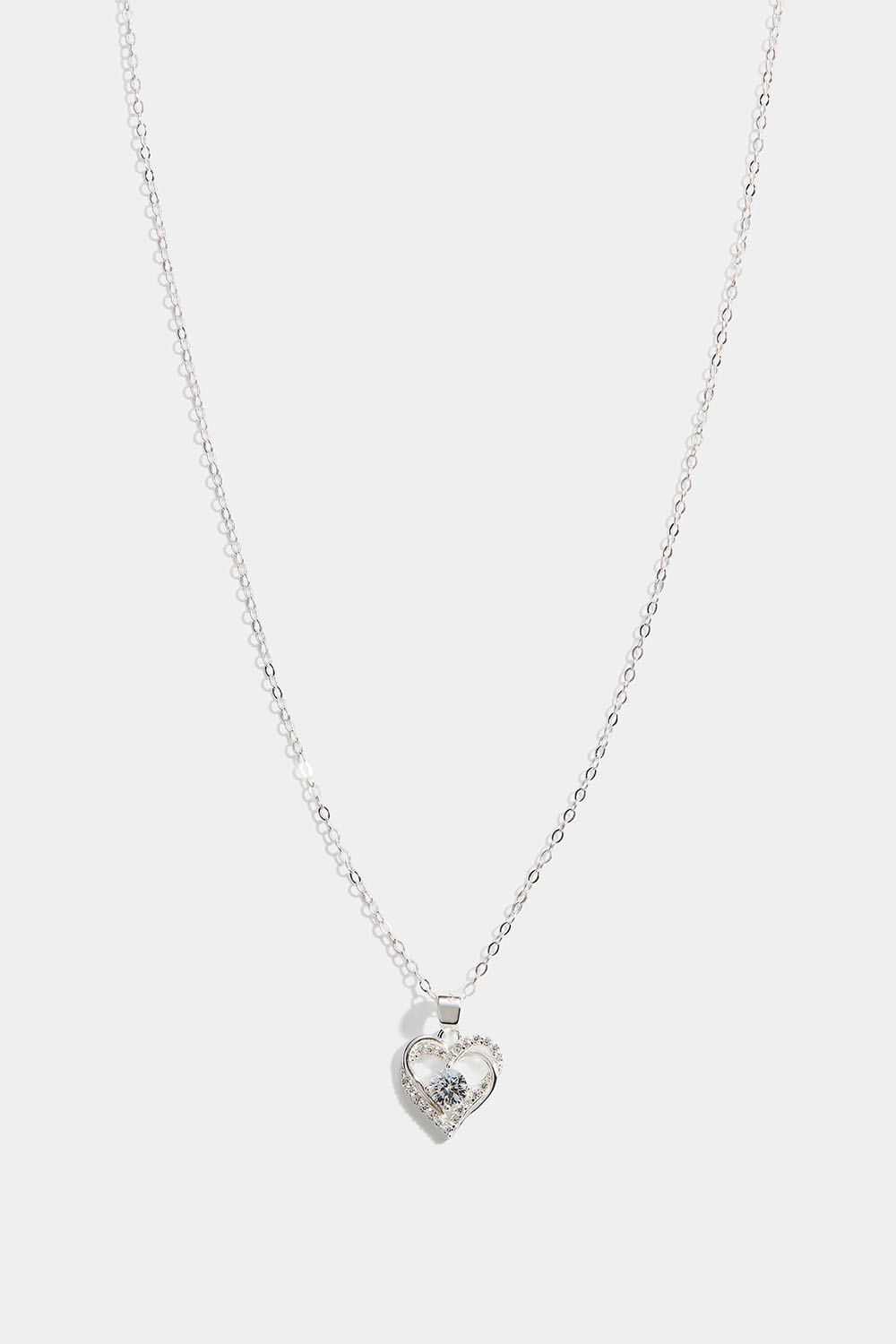 Aito hopeakaulakoru yhteenasetetuilla hopeasydämillä, joista toinen on koristeltu Cubic zirkonia -kivillä. Sydänten keskellä on suurempi kivi.