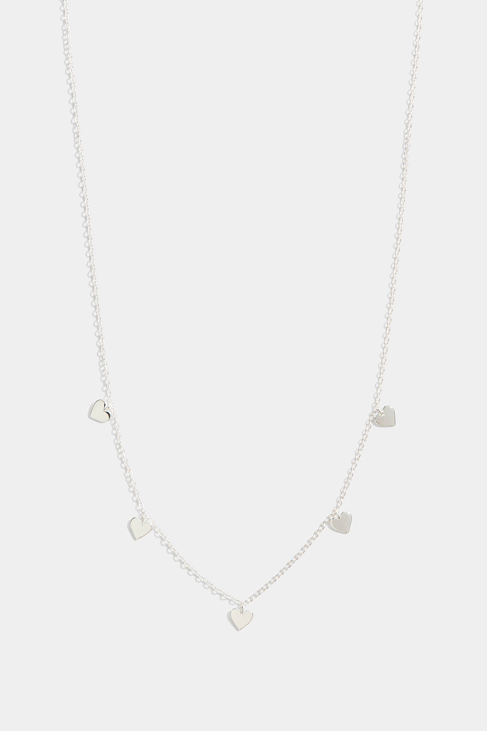 Ohut hopeakaulakoru, jossa viisi riippuvaa sydäntä.