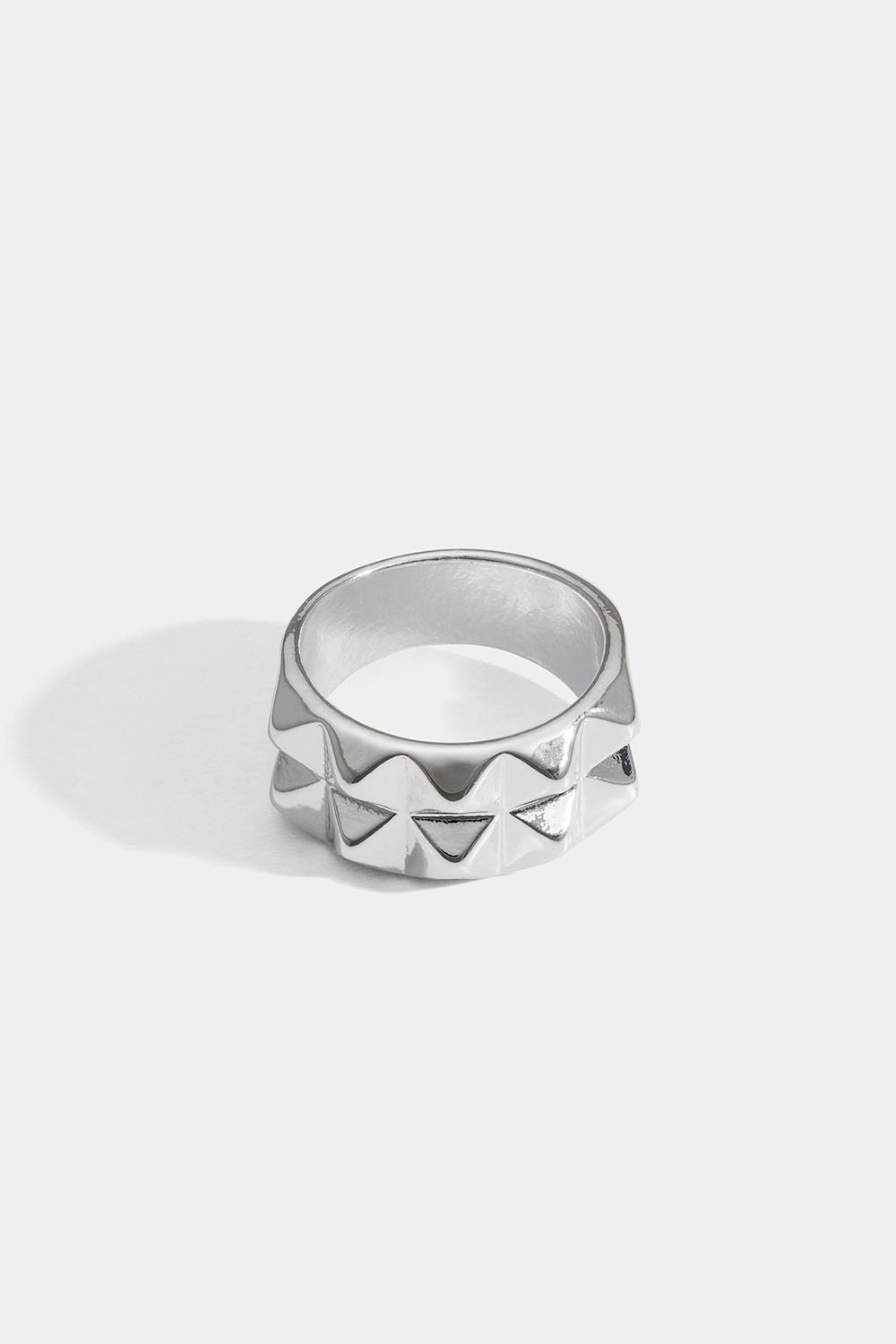 Hopeanvärinen metallisormus, joka on koristeltu kahdella rivillä niittejä.
