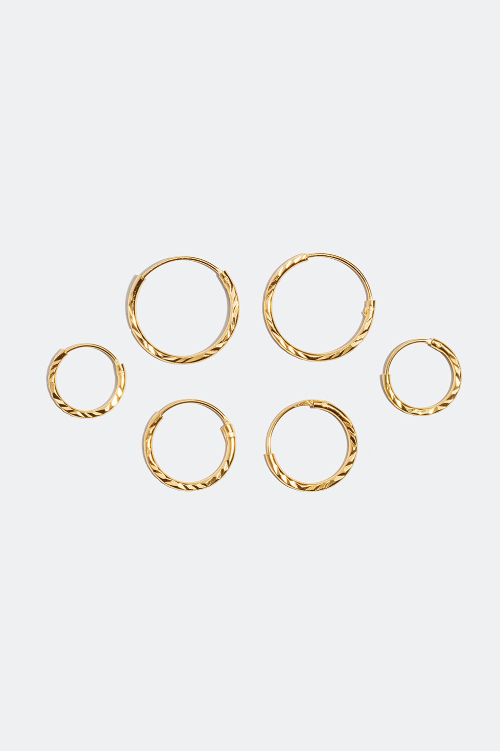Hopearenkaat, 3 parin pakkaus - Kolme paria erikokoisia hopea korvarenkaita kuvioidulla pinnalla.