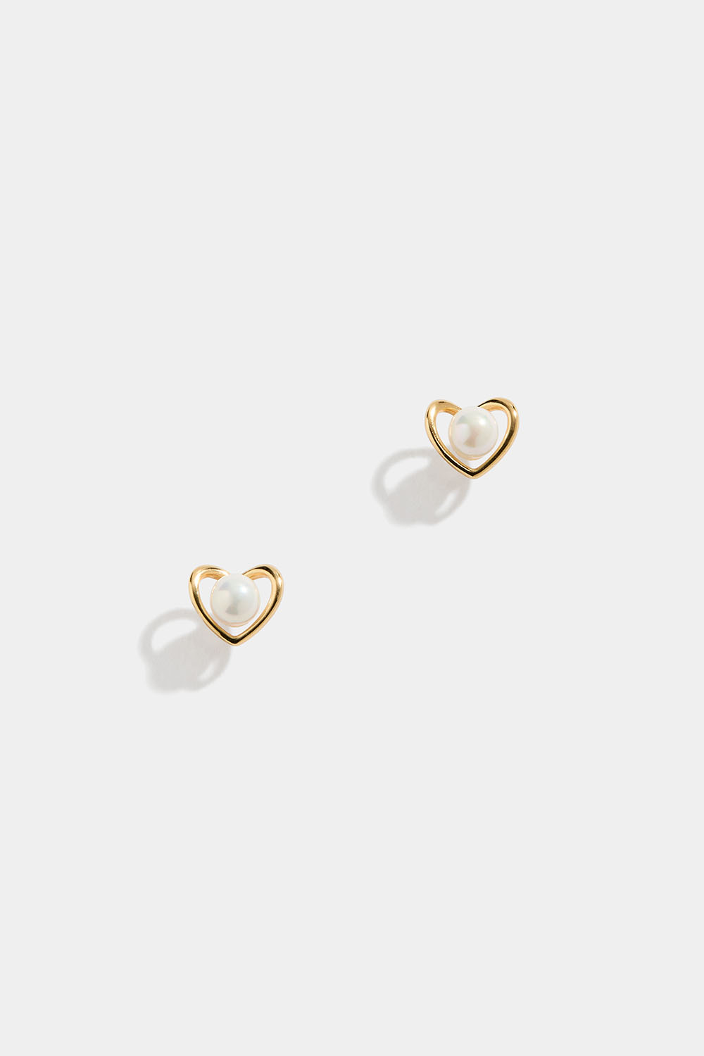 18 k kullalla kullatut hopeasta valmistetut nappikorvakorut, jotka ovat sydämen muotoiset ja joissa on valkoinen helmi keskellä.