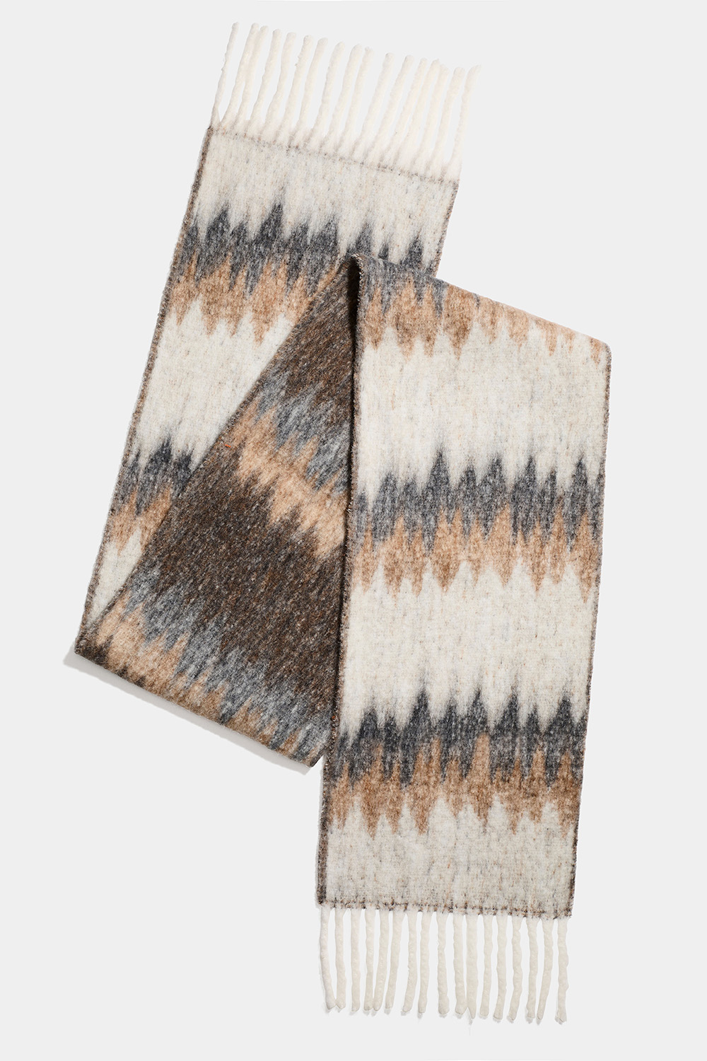 Pehmeä huivi, jossa on ruskea, beige ja harmaa siksak-kuvio ja hapsut.