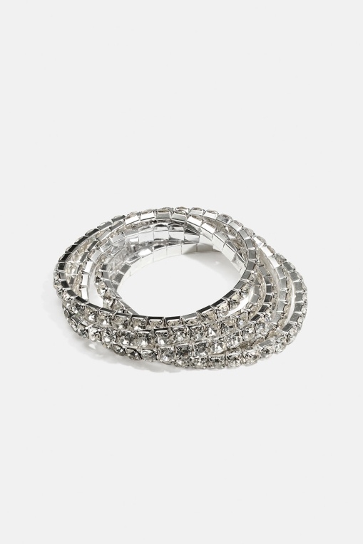 Joustavat rannekorut koristeltuina pyöreillä strassikivillä. Viiden kappaleen pakkaus.