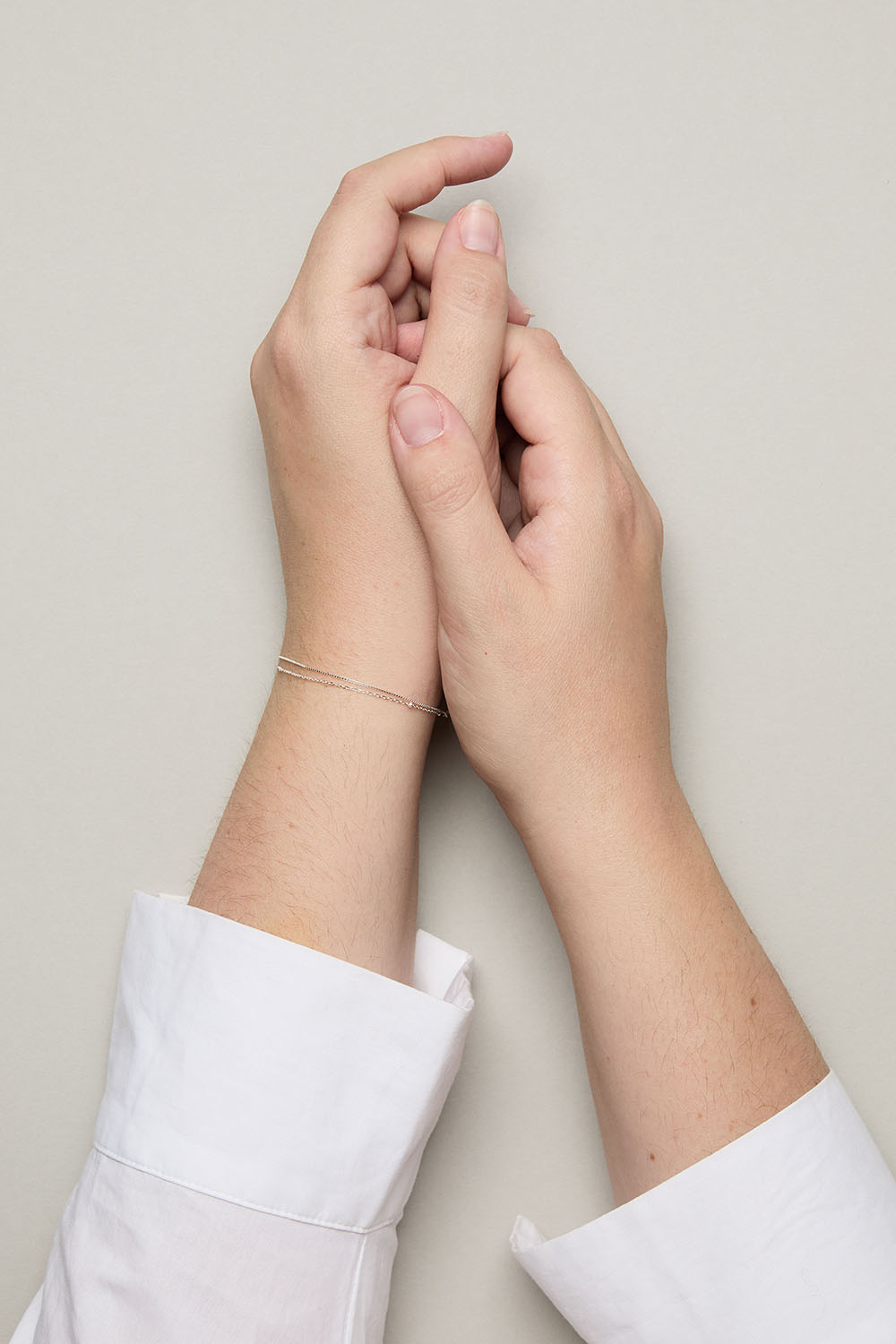 Ohut kaksinkertainen 18k kullattu hopearannekoru, jossa on kaksi ketjua. Yksi pieni kulmikas ketju ja toinen ketju, jossa pieniä hopeapalloja.