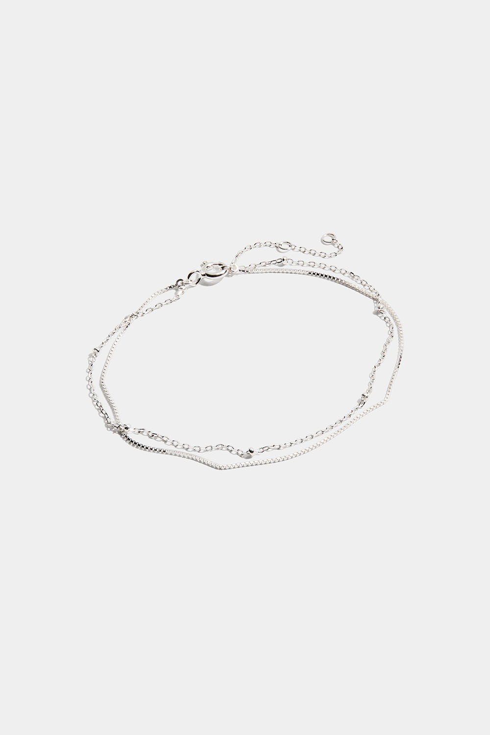 Ohut kaksinkertainen hopearannekoru, jossa on kaksi ketjua. Yksi pieni kulmikas ketju ja toinen ketju, jossa pieniä hopeapalloja.