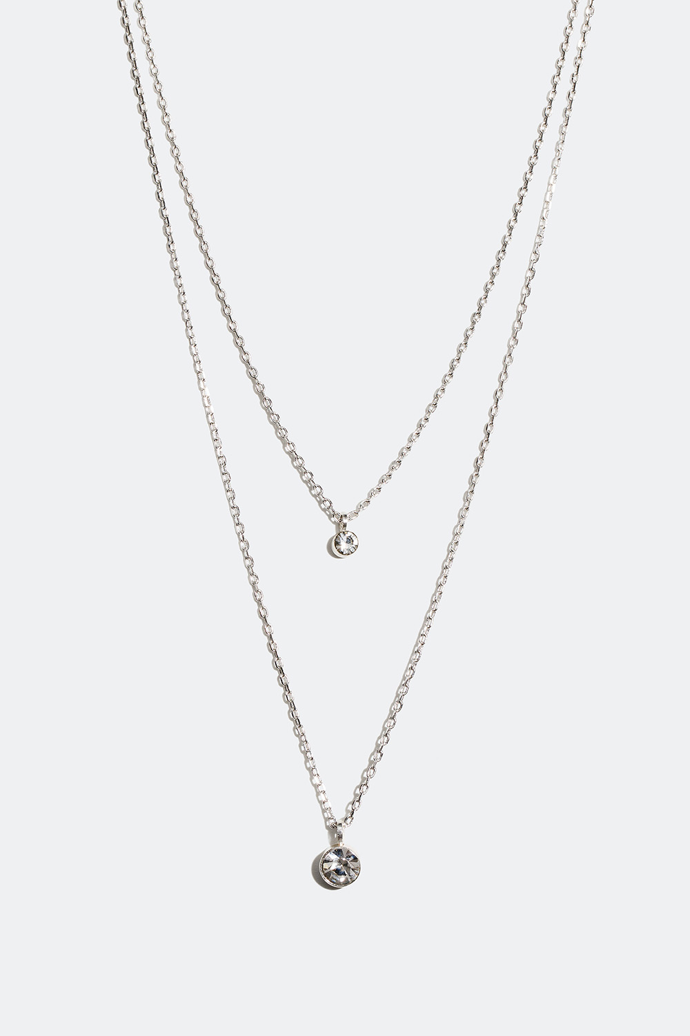 Metallinen kaulakoru, joka koostu kahdesta erimittaisesta ketjusta, joissa kummassakin roikkuu pieni pyöreä lasikivi. Tyylikäs kaulakoru, jossa on hohtava yksityiskohta, joka sopii sekä arkeen että juhlaan. Ketjut kiinnittyvät samaan solkeen, eikä niitä voi käyttää erikseen.