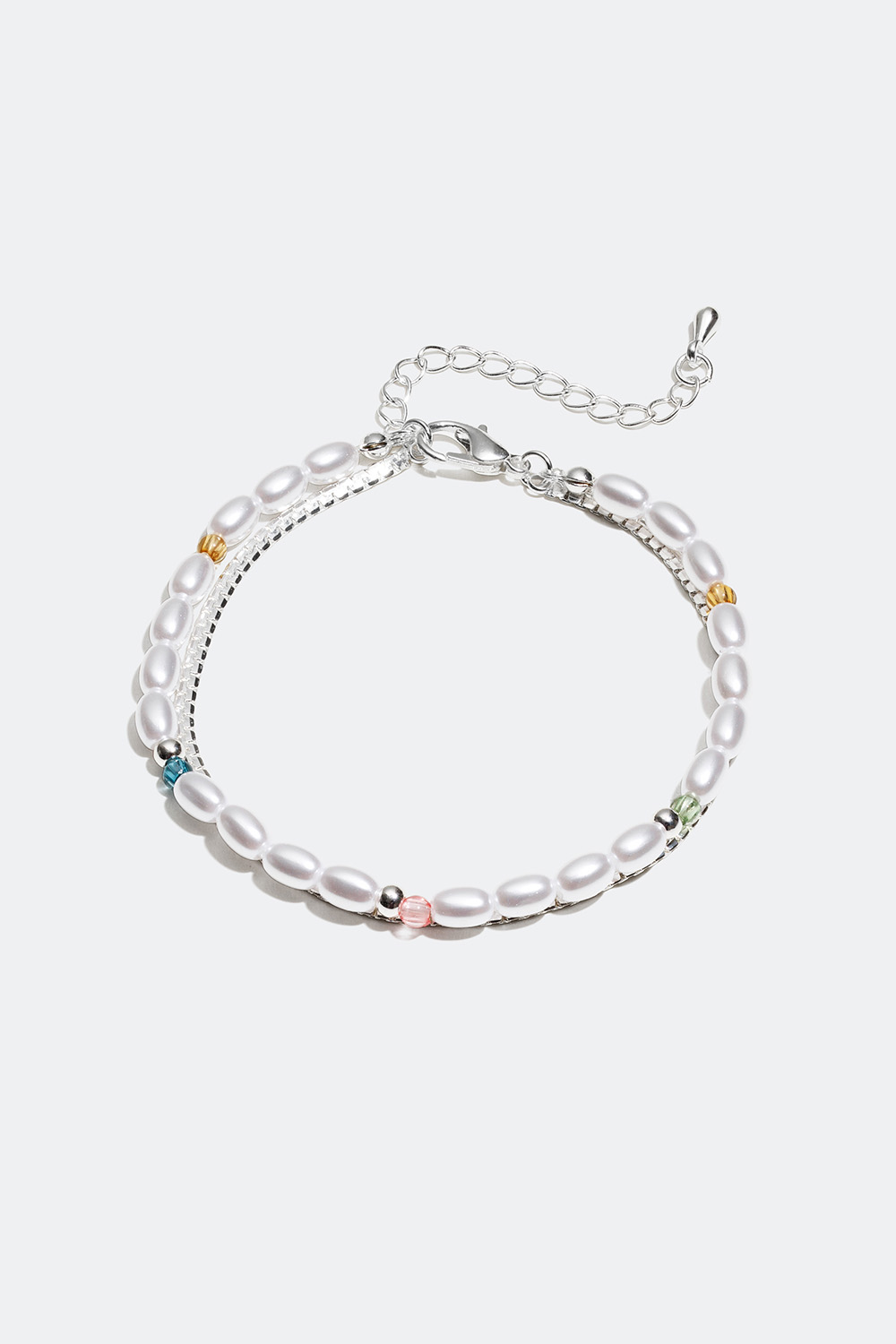 Kaksinkertainen rannekoru, jossa kaksi korua, jotka kiinnittyvät samaan solkeen. Toinen on koristeltu soikean muotoisilla valkoisilla helmillä sekä pienillä metalli- ja pastellivärisillä pyöreillä helmillä. Toinen rannekoru on yksinkertainen ketju, jossa on litteä design. Rannekoru, jossa on kesäistä tunnelmaa, joka sopii täydellisesti mekkoon tai puseroon.