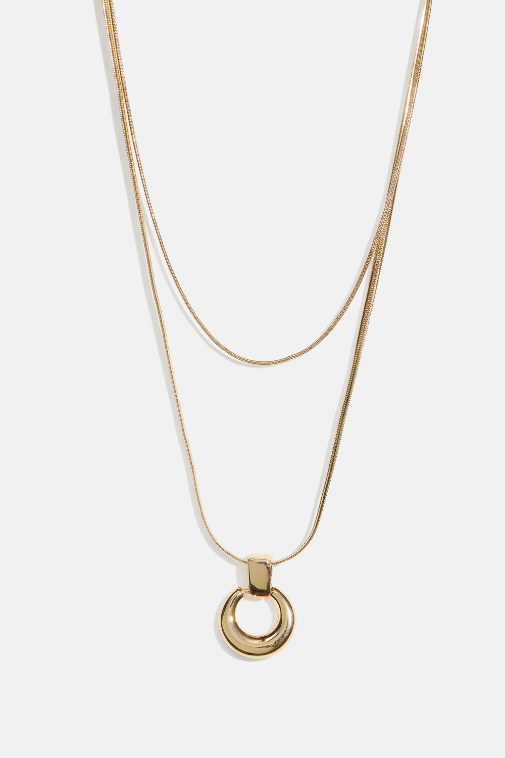 Kaksinkertainen kaulakoru kahdella pituudella, mukana kompakti metalliketju ja pyöreä riipus.