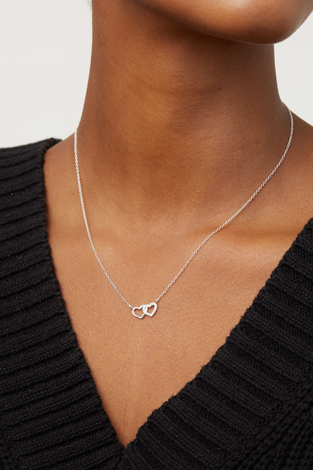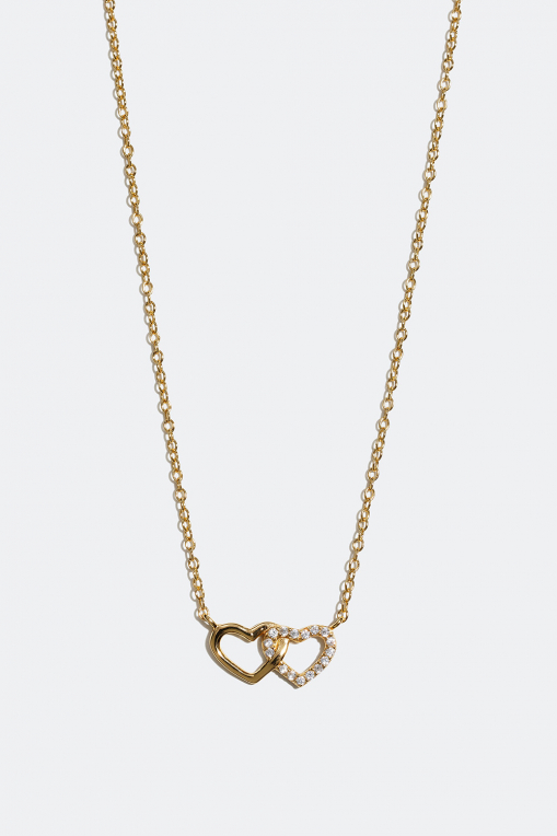 Aito hopeakaulakoru, jossa on 18 karaatin kultaus sekä ketju ja kaksi toisiinsa liitettyä sydäntä. Toinen sydämistä on koristeltu pienillä Cubic Zirconia -kivillä. Tyylikäs koru, joka sopii joka tilanteeseen. Ketju on 42 cm pitkä, mutta siinä on ylimääräinen silmukka 45 cm:n kohdalla, jos haluat pidemmän kaulakorun.