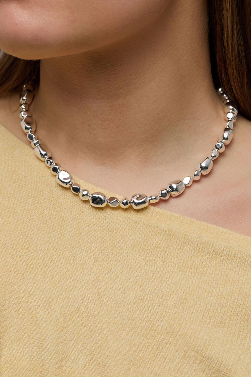 Kaulakoru, jossa on erikokoisia, orgaanisen muotoisia hopeanvärisiä helmiä.